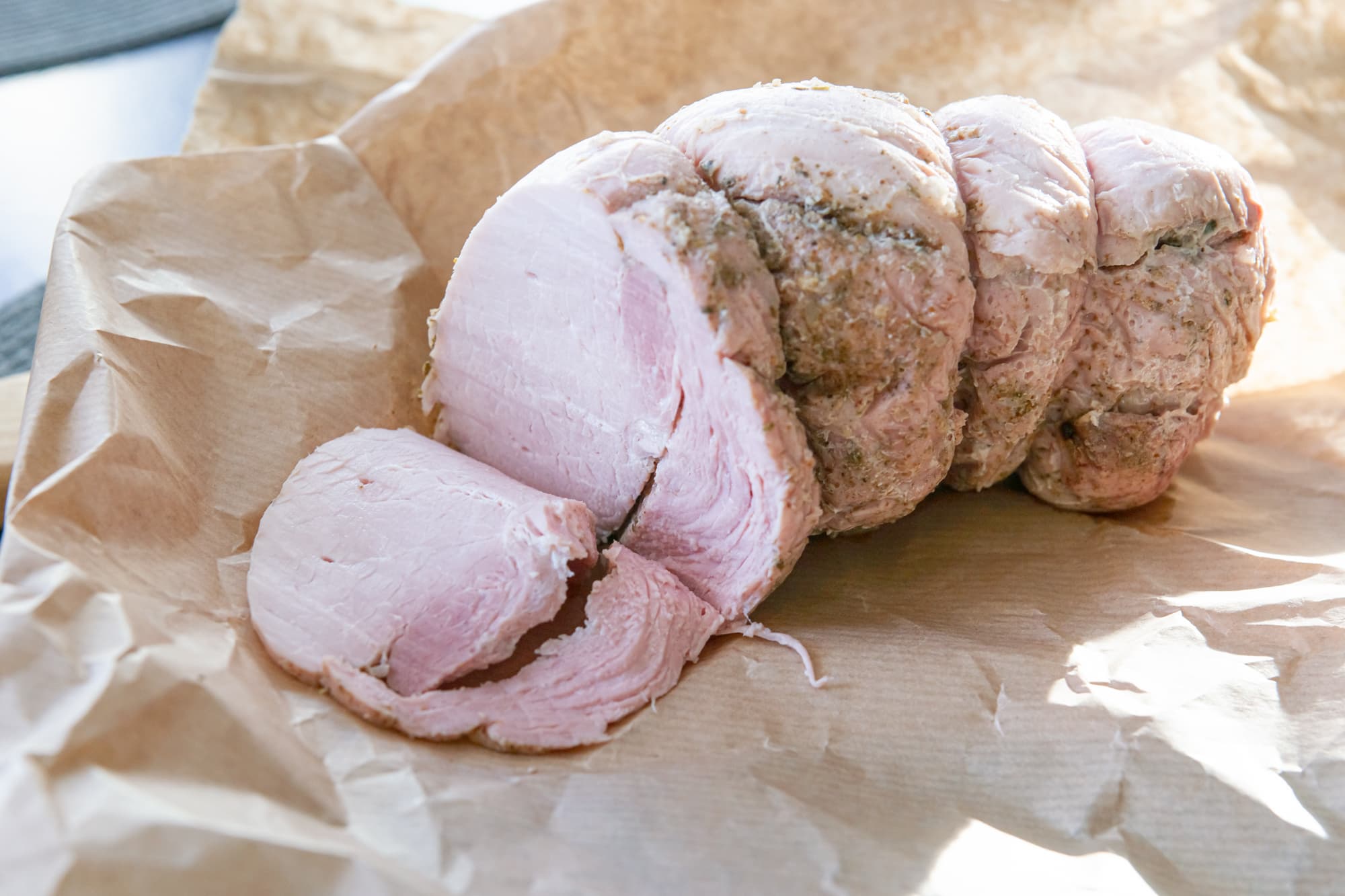Свиной окорок весом 1200 г очистили от пленок и жира. Растворили в холодной воде обычную и нитритную соли и равномерно прошприцевали мясо. Завернули в пакет и отправили на сутки в холодильник.