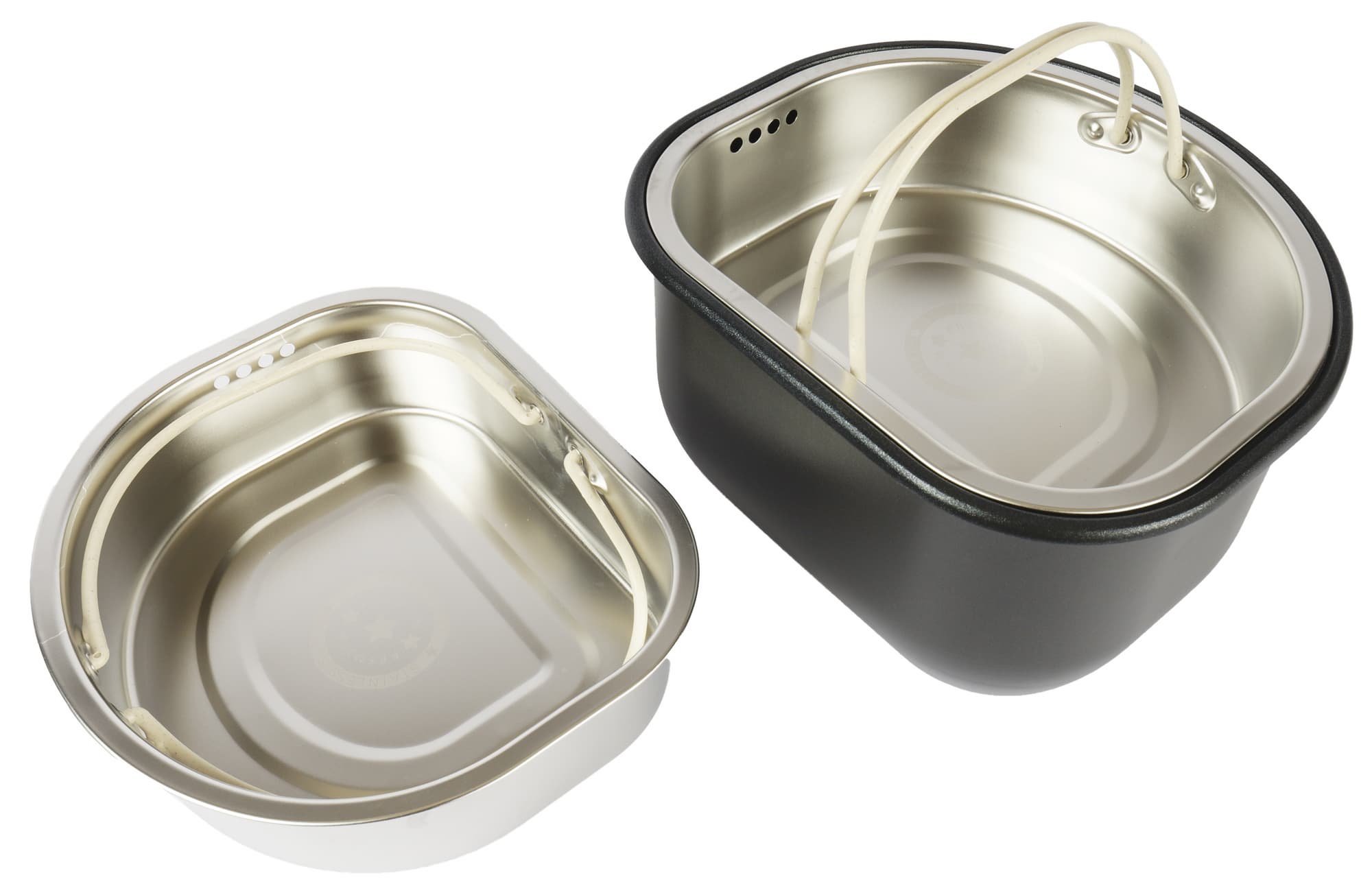 Кроме чаш, мультиварка комплектуется двумя алюминиевыми контейнерами для приготовления на пару́. По верхнему краю емкости есть отверстия: четыре с одной стороны и четыре с противоположной. Для удобного извлечения предусмотрены ручки.