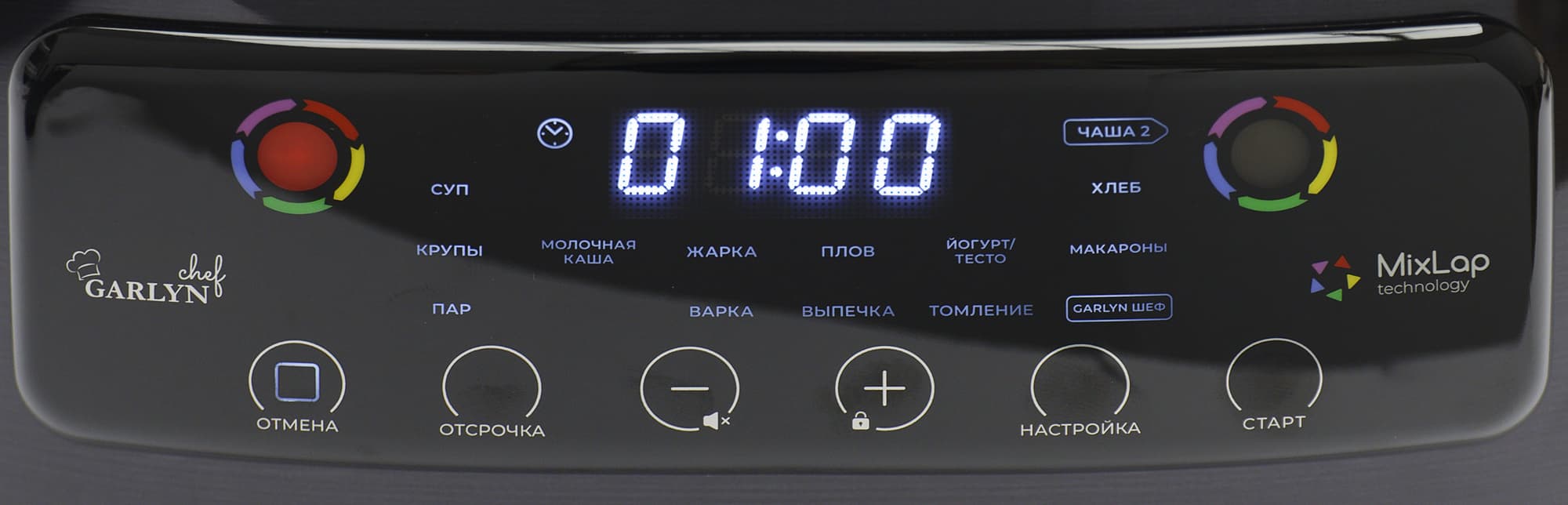 Несмотря на обилие функций, управление Garlyn MR-Duo 10 элементарно и действительно интуитивно понятно. Дисплей достаточно яркий при любом освещении. Звуки, сопровождающие нажатие кнопок, старт и окончание программы, мягкие и ненавязчивые, плюс, их можно отключить.