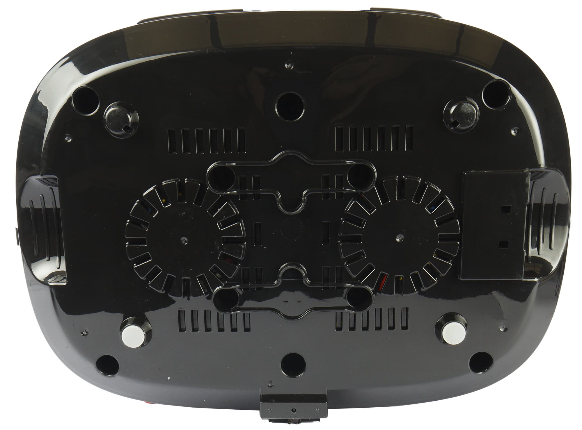 На дне — вентиляционные отверстия, четыре ножки (две из которых прорезинены) и пластиковый упор посередине ближе к задней стенке. По бокам есть два углубления, за которые удобно браться при переноске устройства. В правом углублении скрывается разъем для подключения шнура электропитания.