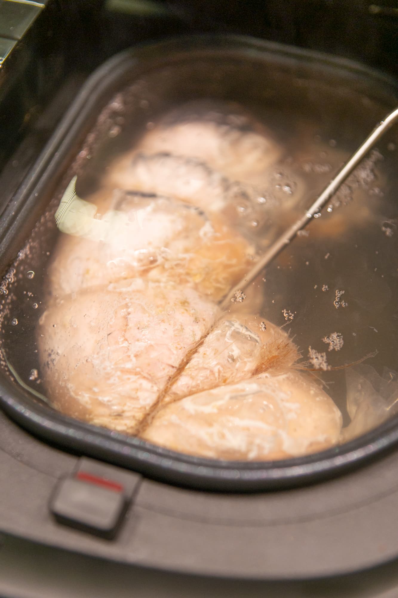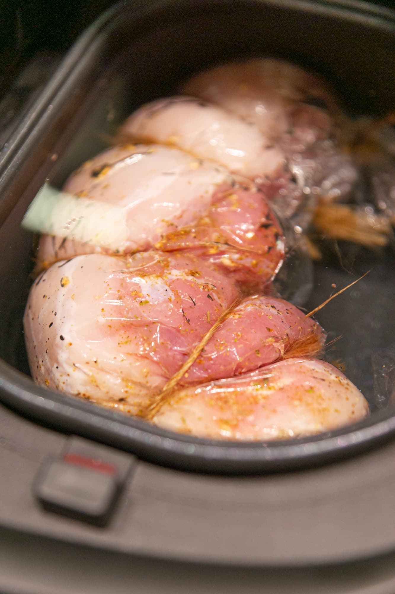 Через 24 часа просоленное мясо обсушили салфетками и натерли смесью специй. Поместили в рукав для запекания, перевязали веревкой и уложили получившийся батон в чашу. Объема чаши для такого куска мяса оказалось достаточно, но впритык. Залили холодной водой, в мясо воткнули термощуп, закрыли крышку и установили режим Garlyn шеф. Первые 2 часа ветчина готовилась при 65 °C, потом мы увеличили нагрев до 75 градусов.