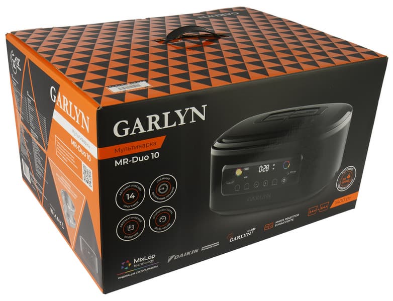 Мультиварка поставляется сразу в двух коробках — внутри транспортной коробки из плотного коричневого картона находилась «парадная» упаковка, оформленная в фирменном стиле Garlyn.