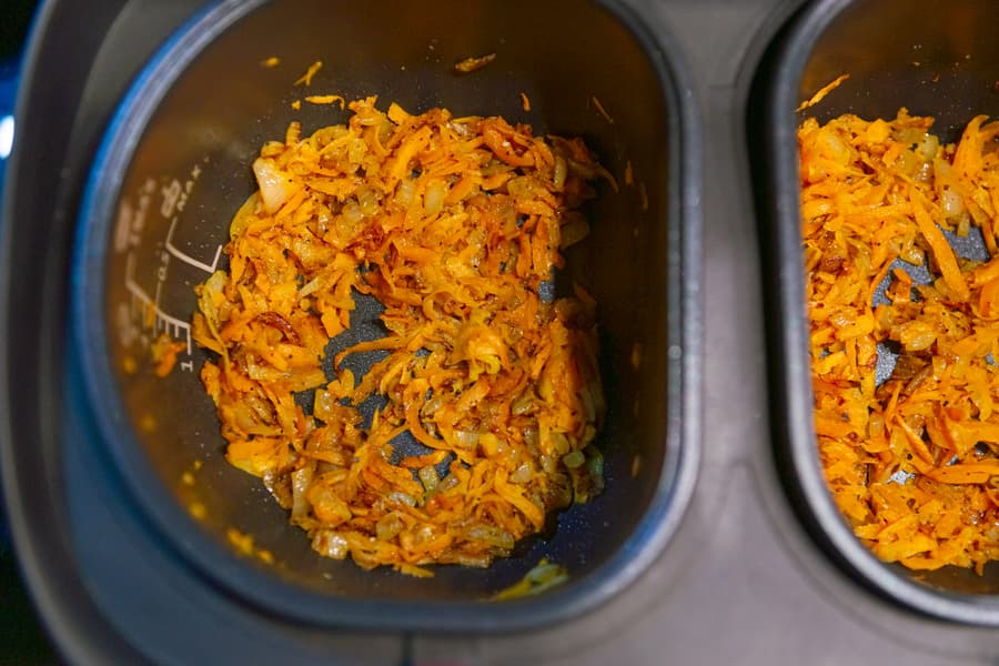 Репчатый лук мелко нарезали, а морковь натерли. Обе чаши включили на режим Жарка и в течение 10 минут обжаривали овощи в небольшом количестве масла.