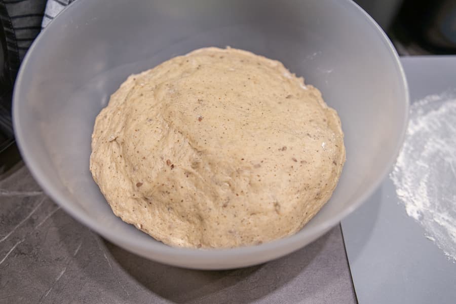 Готовую смесь, рассчитанную на 500 г хлеба, согласно рецепту на упаковке, смешали с водой комнатной температуры, добавили растительного масла и быстродействующих сухих дрожжей. Вымесили тесто и поставили в тепло подниматься. Через час проверили: колобок раздулся и на ощупь был уже совсем готовым для выпечки.