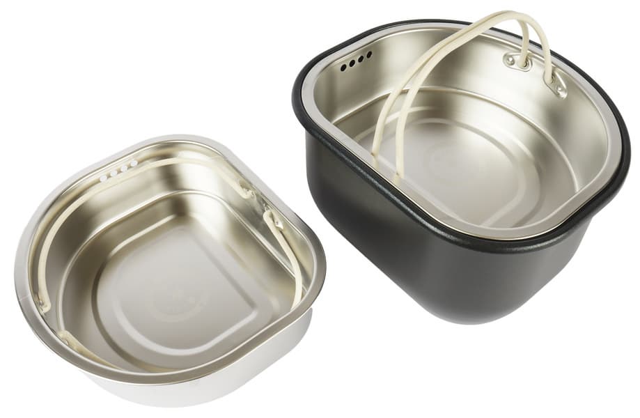 Покрытие чаш нам понравилось. Пригорания и прилипания пищи в них исключены, что делает уход за емкостями абсолютно беспроблемным. Сама конструкция чаш удобна, бортики достаточны для захвата пальцами и легкого извлечения емкости из корпуса. Для извлечения горячих чаш предусмотрены силиконовые прихватки.