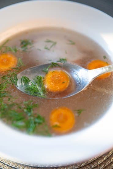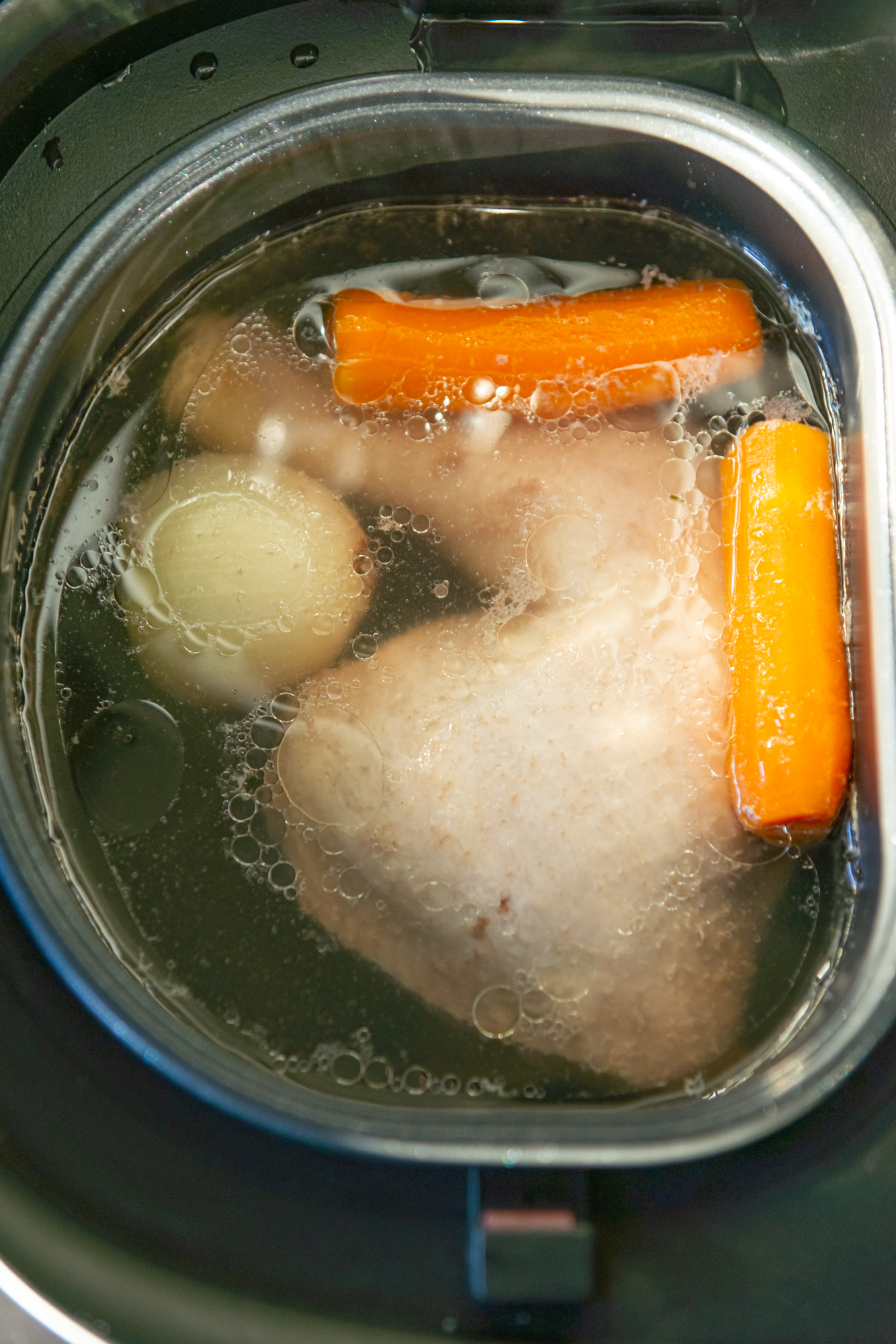 В чашу мультиварки отлично поместился куриный окорочок весом почти 500 г, к нему добавили луковицу, разрезанную на две части небольшую морковку, соль и горошины черного перца. Сначала попробовали режим Суп. Через 15 минут после запуска программы термощуп показал нам, что температура внутри чаши с закрытой крышкой поднялась до 100 °C. Тогда мы сменили режим на Garlyn шеф с нагревом 85 °C и длительностью цикла 1,5 часа. Бульон стабильно варился, температура не менялась в течение всего цикла, и к концу программы мы получили ароматный наваристый бульон.