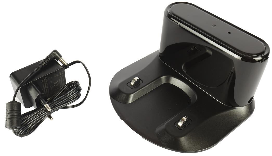 Верхняя часть базы, как и у многих моделей такого типа, — из ИК-прозрачного пластика, под которым стоят датчики. Именно они отвечают за позиционирование робота, когда он едет на зарядку. Светодиод на базе сигнализирует о ее подключении сети. Контакты подпружинены, их ход — около 3 мм.
