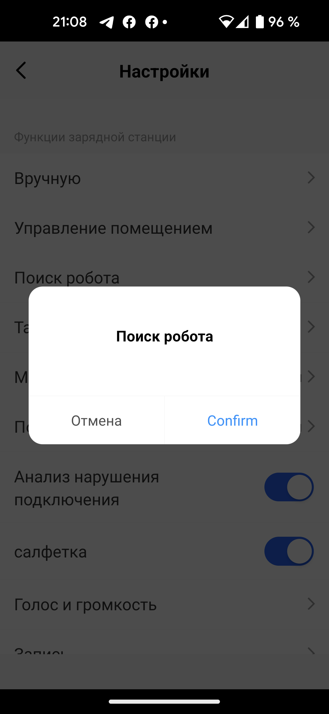 Пункт «Поиск робота» заставляет потерявшийся или застрявший в дальнем углу прибор подать голос.