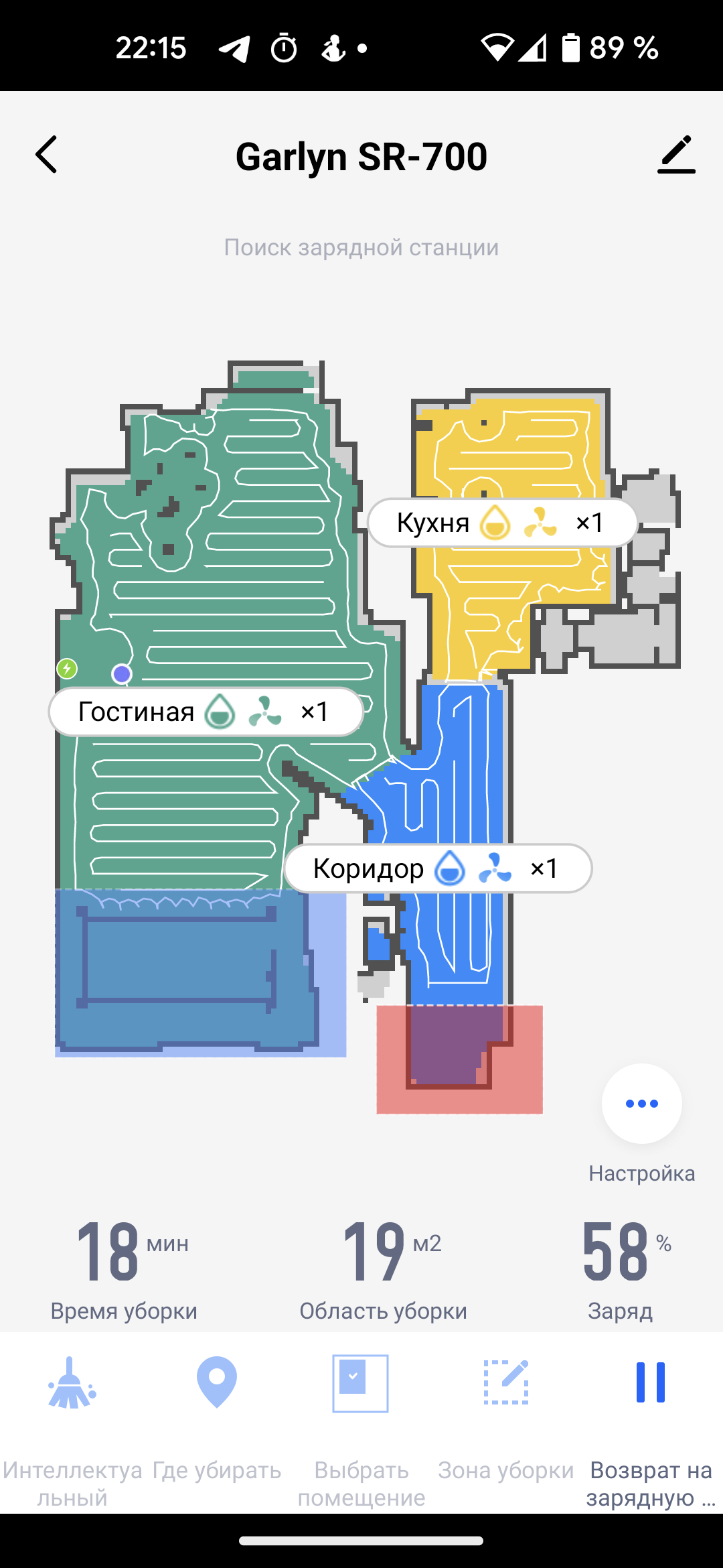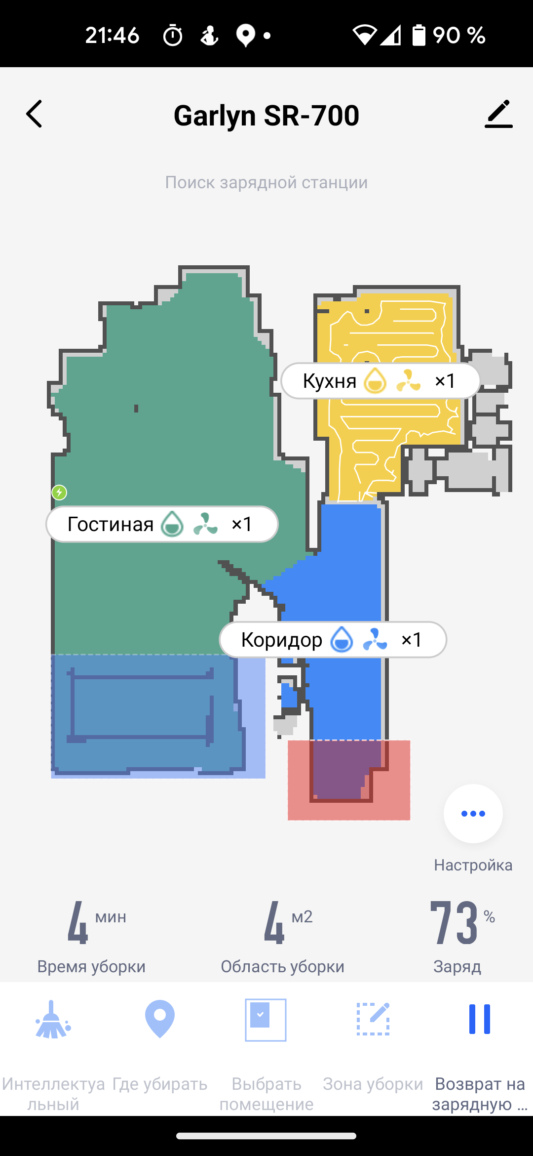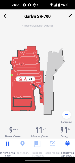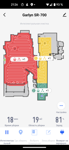 На главном экране приложения мы видим карту помещения (так, как она выглядит с точки зрения робота), время текущей уборки, площадь, которую обошел прибор, и оставшийся процент заряда аккумулятора. Иконки в нижней части позволяют запустить устройство в автоматическом режиме (пункт «Интеллектуальный»), выбрать режим локальной уборки и вернуть прибор на базу.