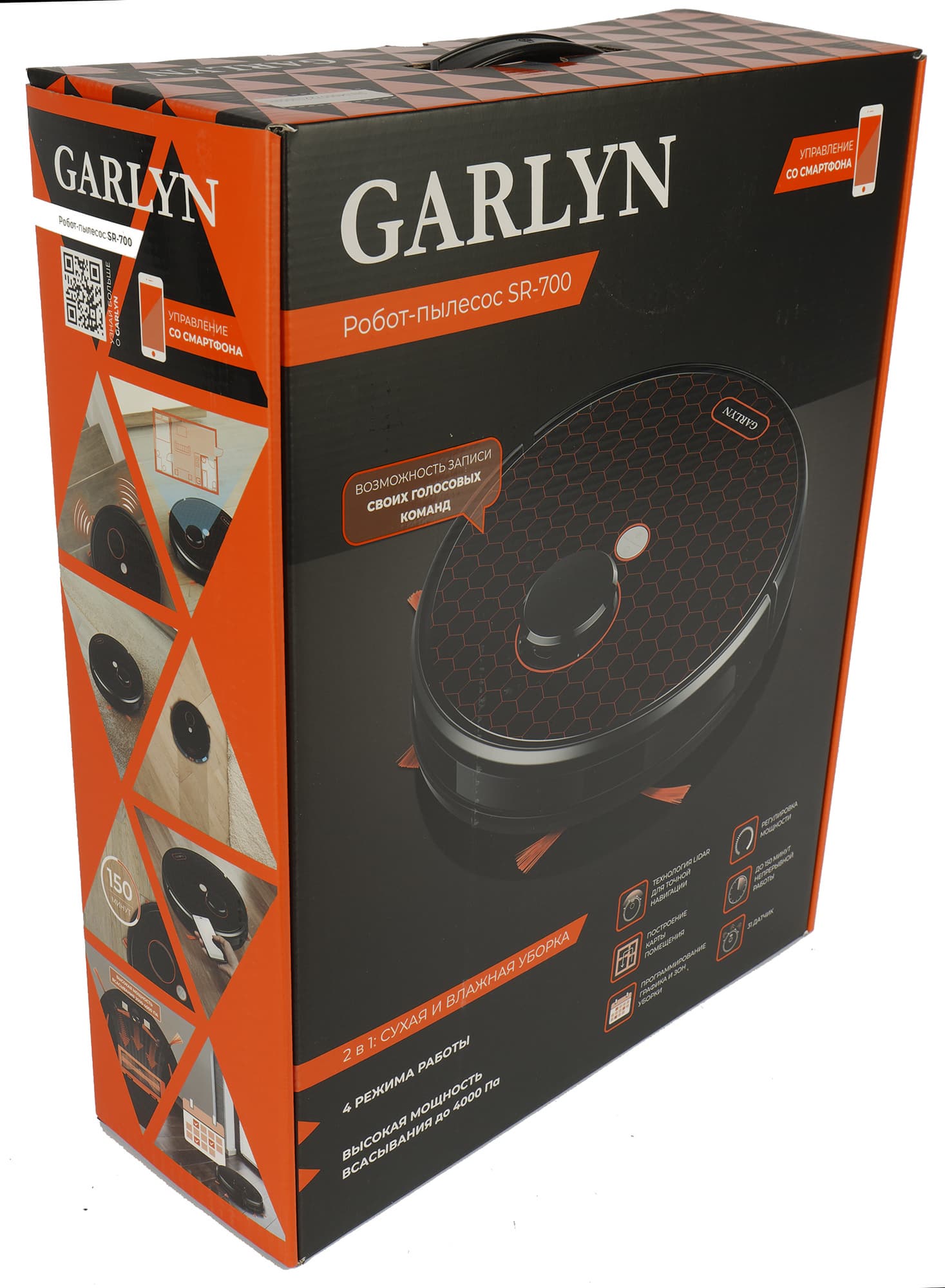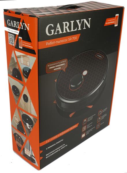 Пылесос упакован в коробку из цветного картона, оформленную в фирменном стиле Garlyn: оранжевое и черное. На ее передней стороне производитель разместил цветную фотографию робота и перечислил главные особенности модели. К ним отнесены сухая и влажная уборка, лазерная навигация, умение строить подробные карты помещений, возможность программирования графика и зон уборки и регулировка мощности всасывания, достигающей 4000 Па.