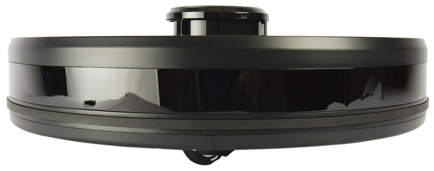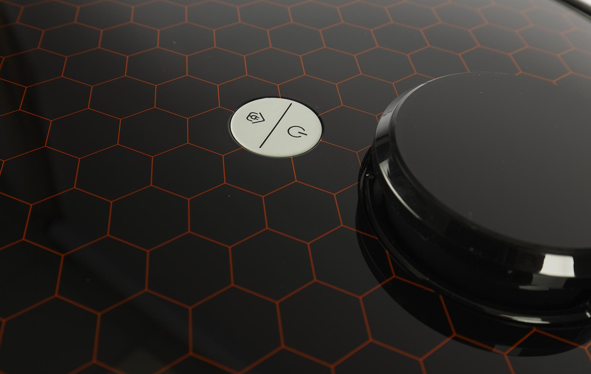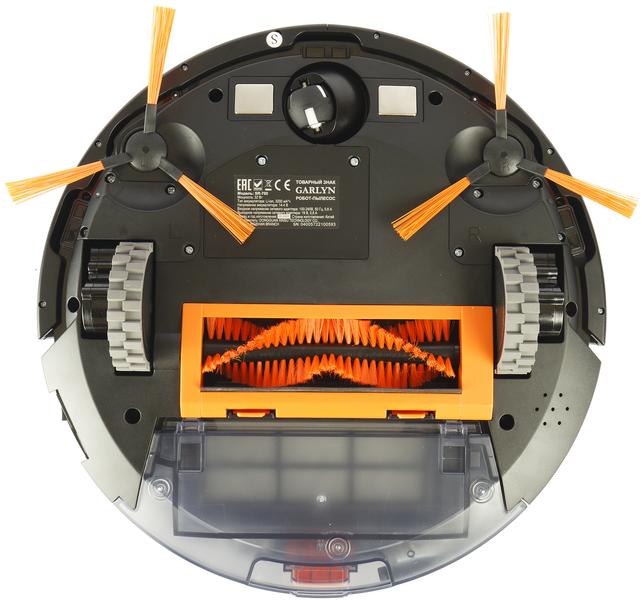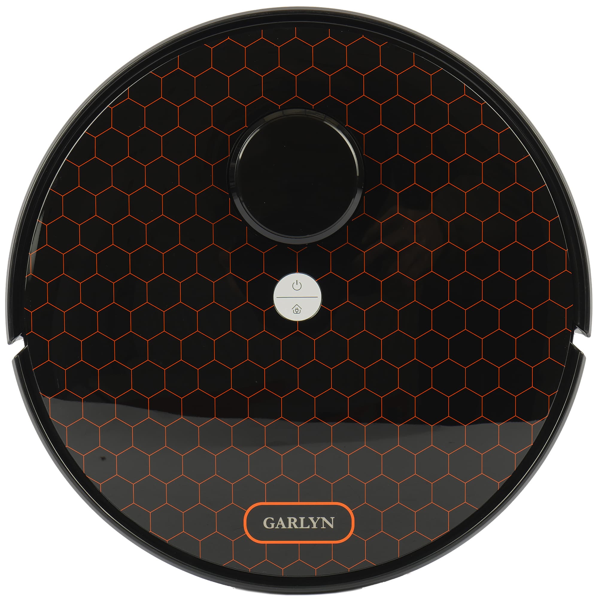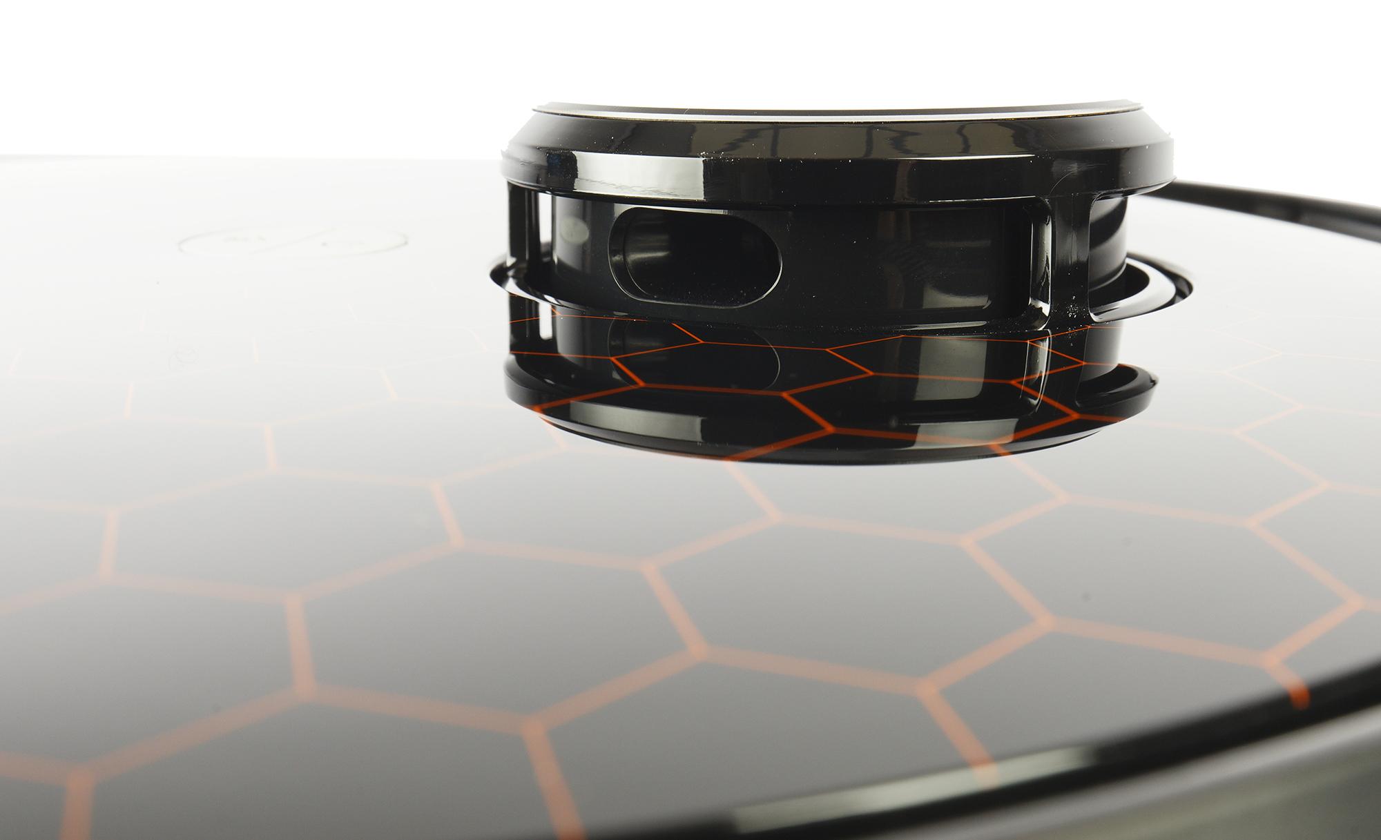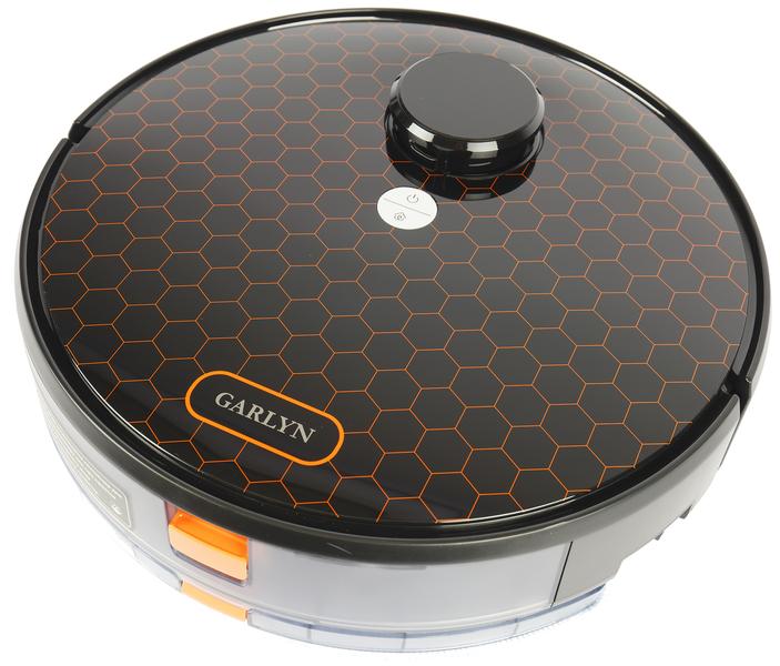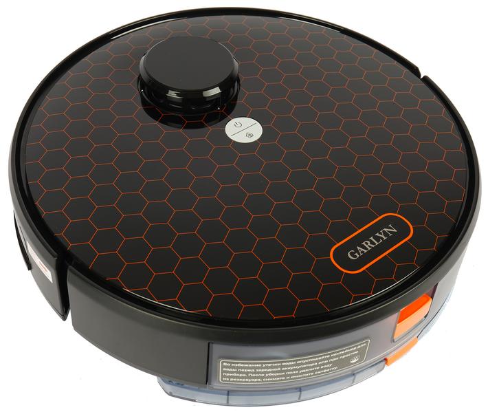 Большинство роботов-пылесосов круглые, и Garlyn SR-700 не исключение. Глянцевая верхняя панель его черного пластикового корпуса декорирована оранжевыми шестиугольниками — мы уже встречали такой дизайн у приборов производителя. Выглядит достаточно симпатично и невольно навевает мысли о работоспособности модели: вспомним выражение «трудится, как пчелка».