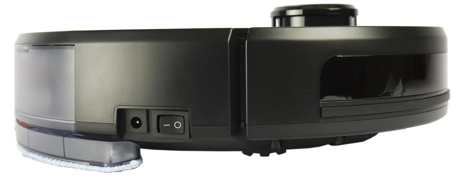 Как и большинство роботов-пылесосов, наш прибор опирается на три колеса. Переднее, опорное, смонтировано в пластиковой сфере и может вращаться на 360°. Боковые — ведущие: рельефные покрышки обеспечивают модели хорошее сцепление с любыми напольными покрытиями. Клиренс пылесоса изменяется от 8 до 34 миллиметров, так что неровности пола и пороги для него не проблема, да и под большую часть мебели он проходит без труда.