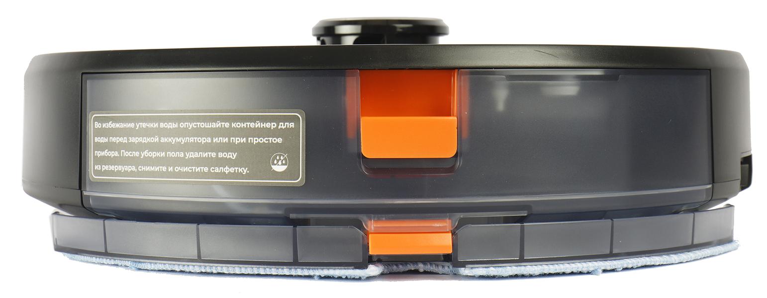 Съемная рамка для влажной уборки прикрепляется к нижней части контейнера и держится на защелке оранжевого цвета. Вода из бака увлажняет D-образную салфетку через три отверстия.