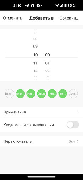 «Таймер» подразумевает настройку запуска по расписанию. Здесь мы можем указать время начала уборки в автоматическом режиме и день недели. Настроить количество проходов по помещению или запрограммировать посещение отдельных комнат тут нельзя.