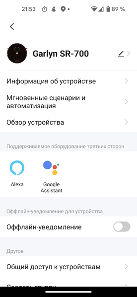 В разделе дополнительной информации можно узнать сетевой адрес пылесоса, версию встроенного программного обеспечения и некоторые другие технические подробности. Здесь же можно подключить один из двух голосовых помощников (Google Assistant или Amazon Alexa) и поделиться правами на управление устройством с членами семьи.
