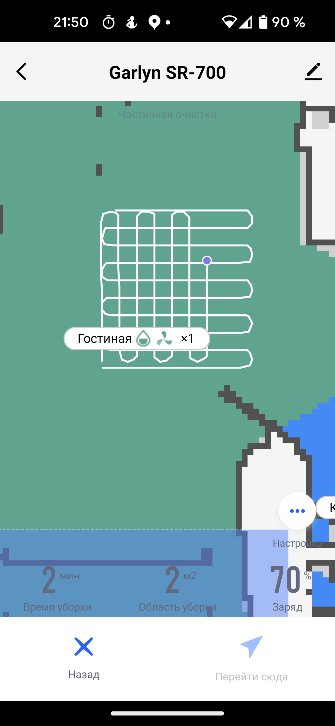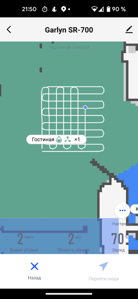 Попадая в помещение, где он еще ни разу не был, пылесос рисует план обстановки: стены и другие препятствия, которые распознал его сенсор. Еще до начала работы в приложении можно посмотреть не только ту комнату, в которой робот планирует трудиться, но и частично соседние. В процессе уборки карта совершенствуется.