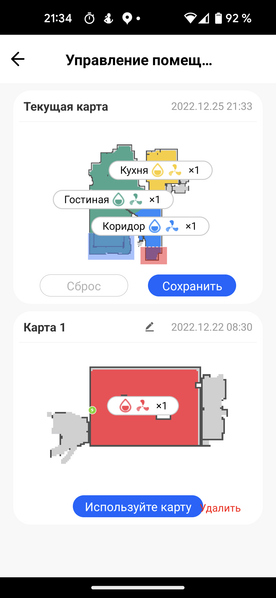 На странице «Управление картой» можно переключать ранее созданные планы помещений, чтобы пылесос не обходил их заново. Эта опция окажется полезной для владельцев многоуровневых квартир или загородных домов: робот не умеет, к сожалению, преодолевать лестницы, и с этажа на этаж его придется переносить вручную, переключая карты в приложении.