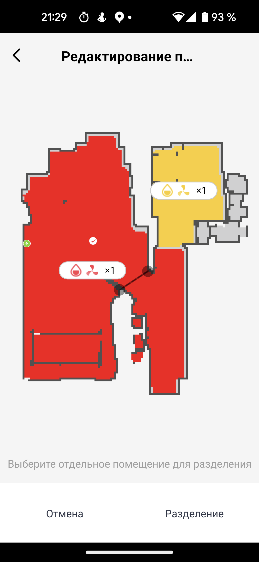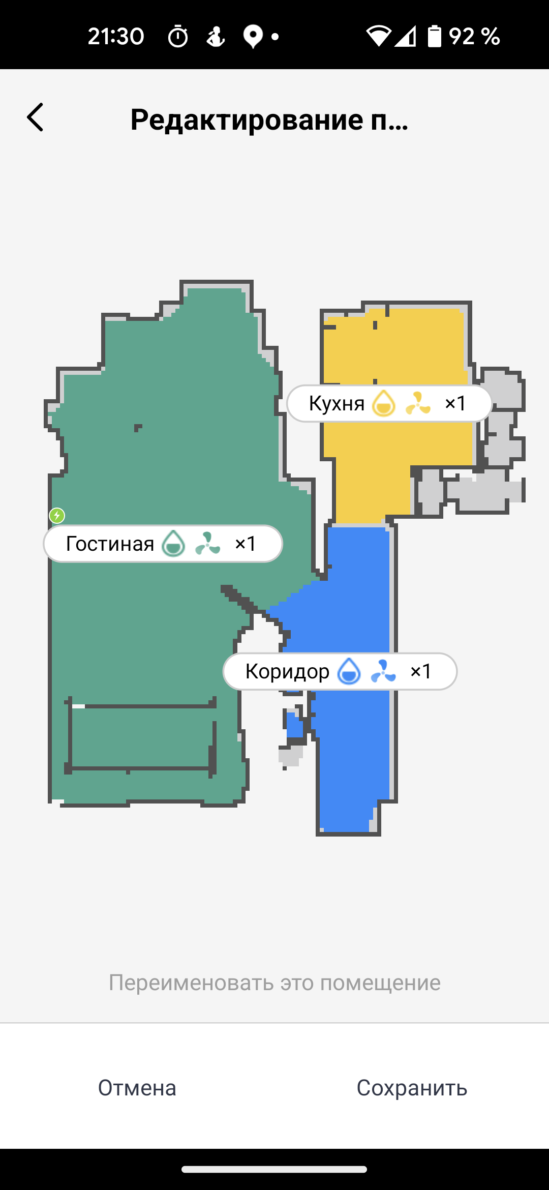 Все помещения квартиры или дома определяются автоматически и маркируются разными цветами. Но если планировка слишком сложна, устройство может спасовать. Тогда у пользователя есть возможность вручную указать границы, объединяя или разделяя созданные прибором зоны, переименовать помещения и указать запретные для сухой или влажной уборки участки.