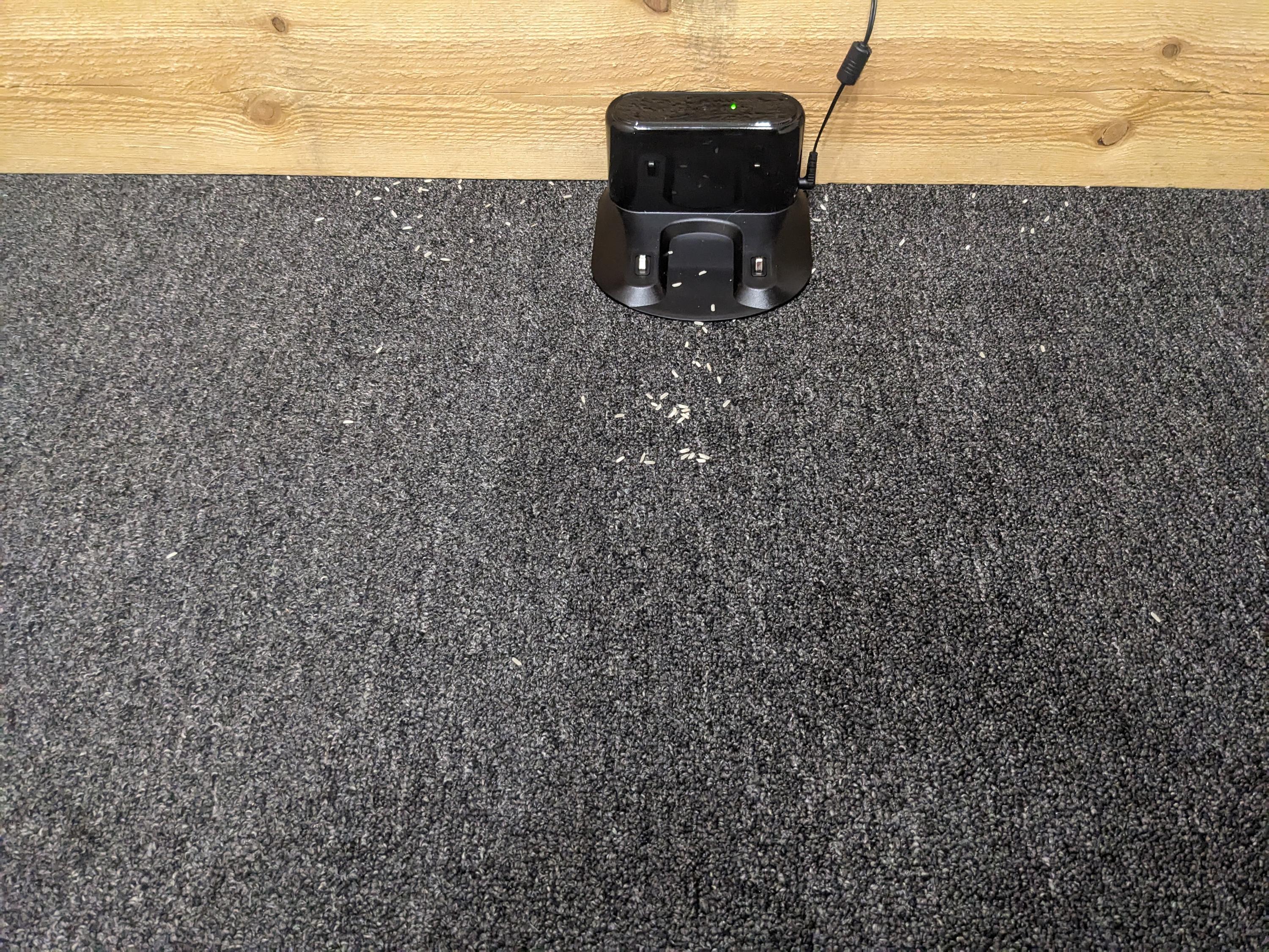 С третьего запуска пылесос убрал 99,1% мусора. Это почти идеальный результат: мы, как ни старались, не смогли обнаружить зерен риса даже в углах помещения. Оставшиеся 0,9% располагались возле базы: ее пылесос аккуратно обходил на расстоянии в 30-40 сантиметров.