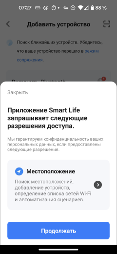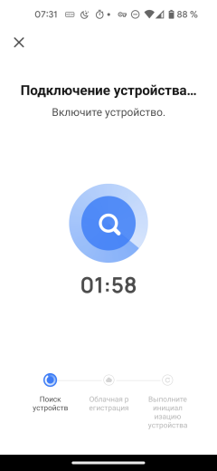 Для начала синхронизации следует воспользоваться кнопкой «Добавить устройство» на первом экране приложения и дать разрешение на доступ к информации о местоположении смартфона. Затем следует ввести SSID и пароль от сети, в которой будет работать пылесос, выбрать в списке поддерживаемых устройств «Мелкая бытовая техника/Робот-пылесос (W-Fi)» и, следуя инструкциям приложения, активировать на приборе режим синхронизации. Для этого требуется долгое, до звукового сигнала, нажатие на кнопку включения.