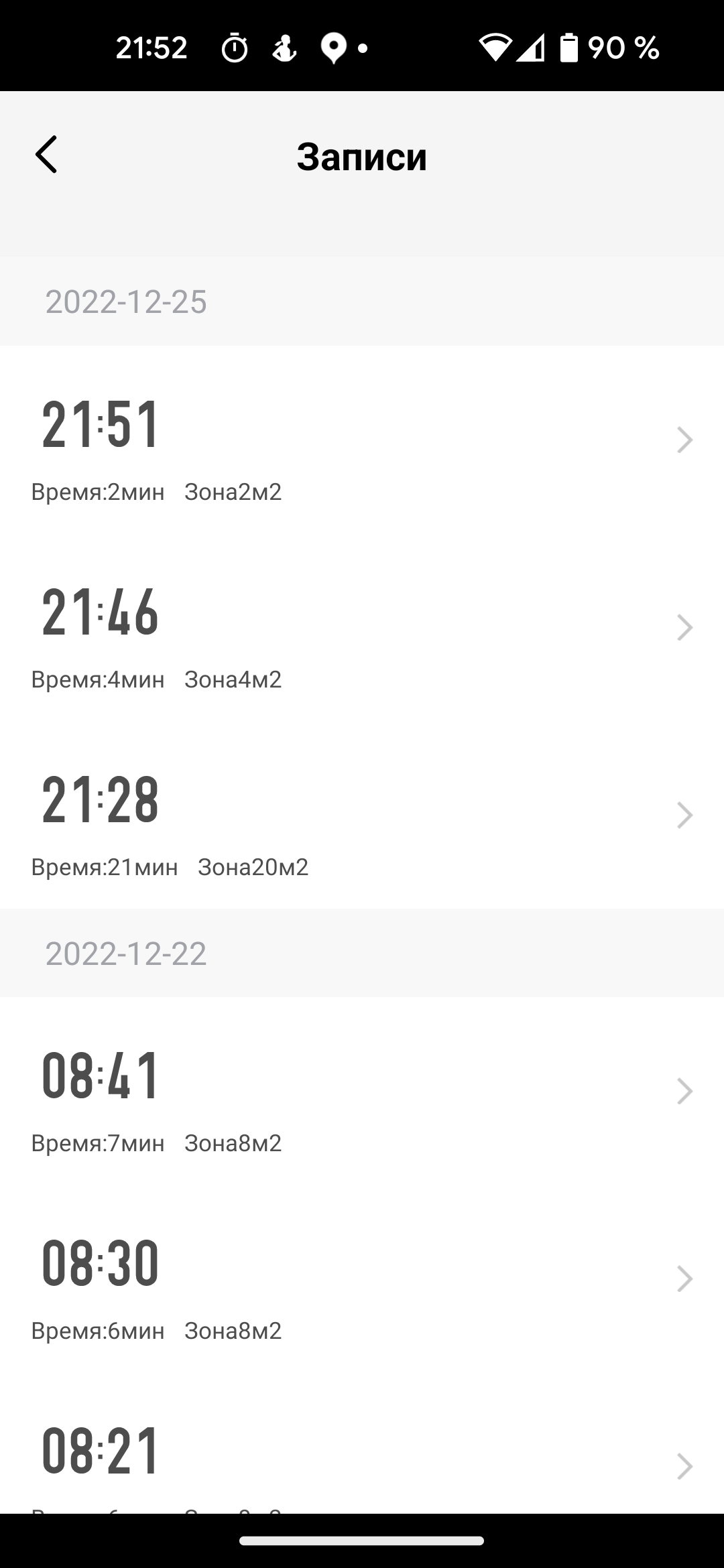 Раздел «Записи» позволяет ознакомиться со списком выполненных работ: доступны сведения о продолжительности и площади убранной поверхности.