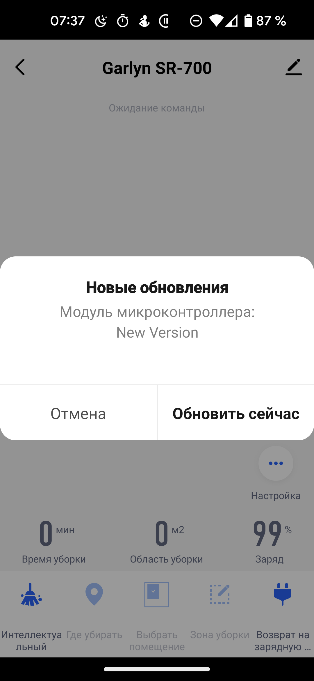 После успешного соединения приложение предлагает проверить наличие свежей микропрограммы для пылесоса и обновить его.