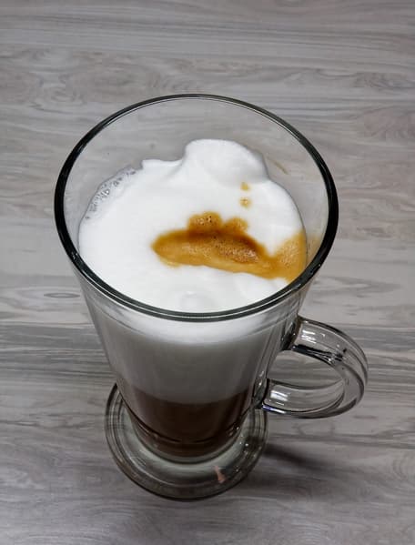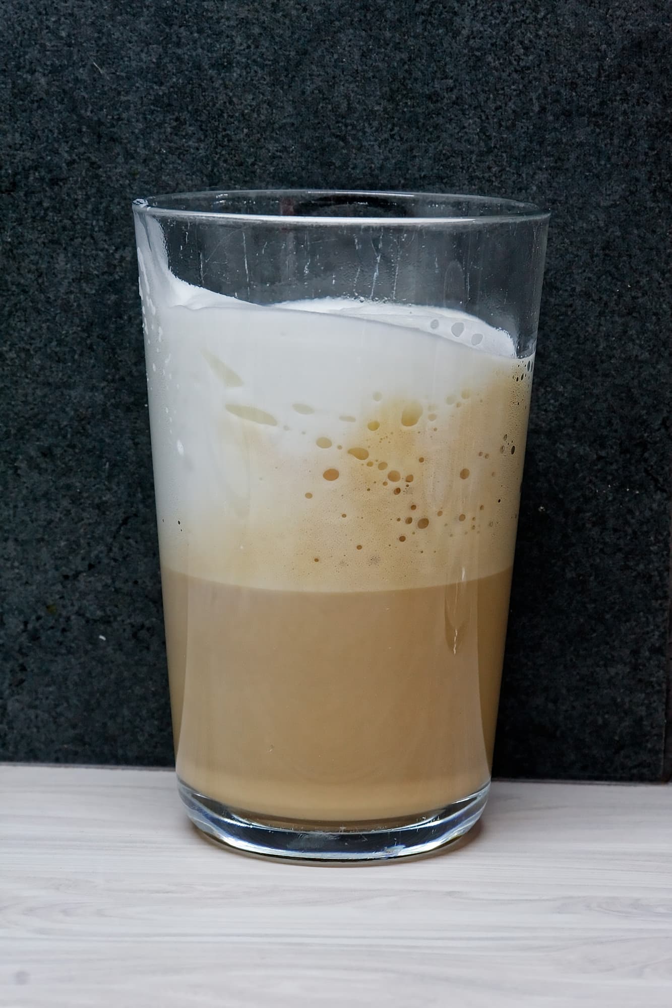 Мы влили в высокий стакан сначала эспрессо, потом — содержимое вспенивателя, получив таким образом напиток, близкий по своим характеристикам к классическому капучино.