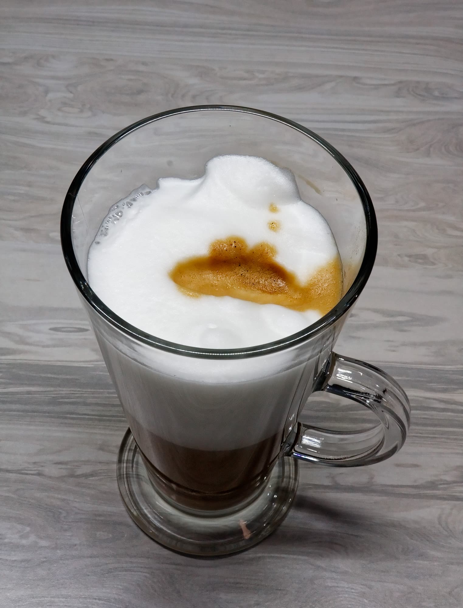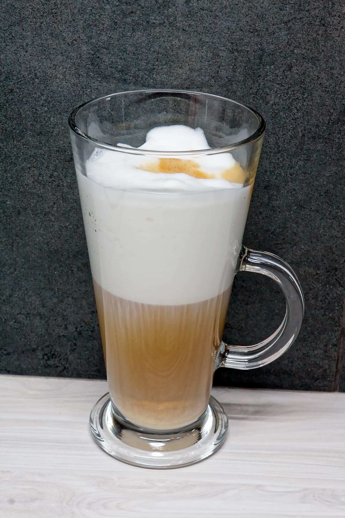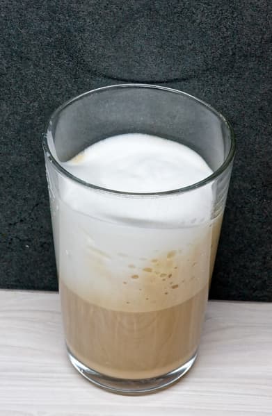 В результате получили вариацию латте макиато — горячего кофейного напитка, полученного путем вливания в молоко кофе-эспрессо в пропорции 3:1.
