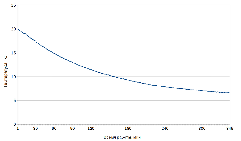 Прибор работал существенно дольше, чем предыдущая протестированная модель: до появления на экране сообщения «Cheers!», сигнализирующего об окончании процесса, прошло 345 минут. Температура жидкости в бутылке составила 6,63 °C — примерно на полградуса выше заданной.