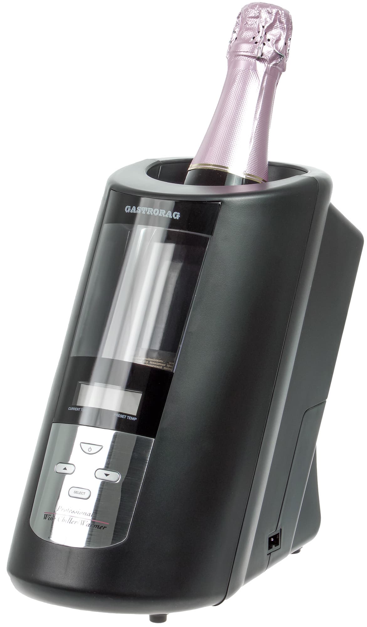 Текст на боковых сторонах сообщает, что JC7910 предназначен не только для охлаждения, но и для подогрева бутылок до нужной температуры, которая устанавливается с помощью встроенной в прибор базы данных вин — оптимально для каждого сорта. Устройство имеет тот же принцип действия — термоэлектрический, — что исключает образование льда или капель на бутылке. Также охладитель (а вернее, все-таки кондиционер) снабжен ЖК-дисплеем и прозрачным окном с подсветкой.