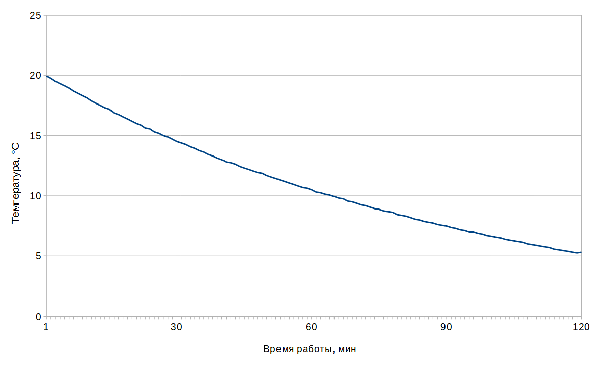 Стандартную бутылку шампанского емкостью 0,75 л и температурой 20 °C мы снабдили термодатчиком, поместив его в жидкость возможно ближе к центру емкости, и включили прибор, выбрав минимальную температуру (режим «Игристое вино», 6 °C).