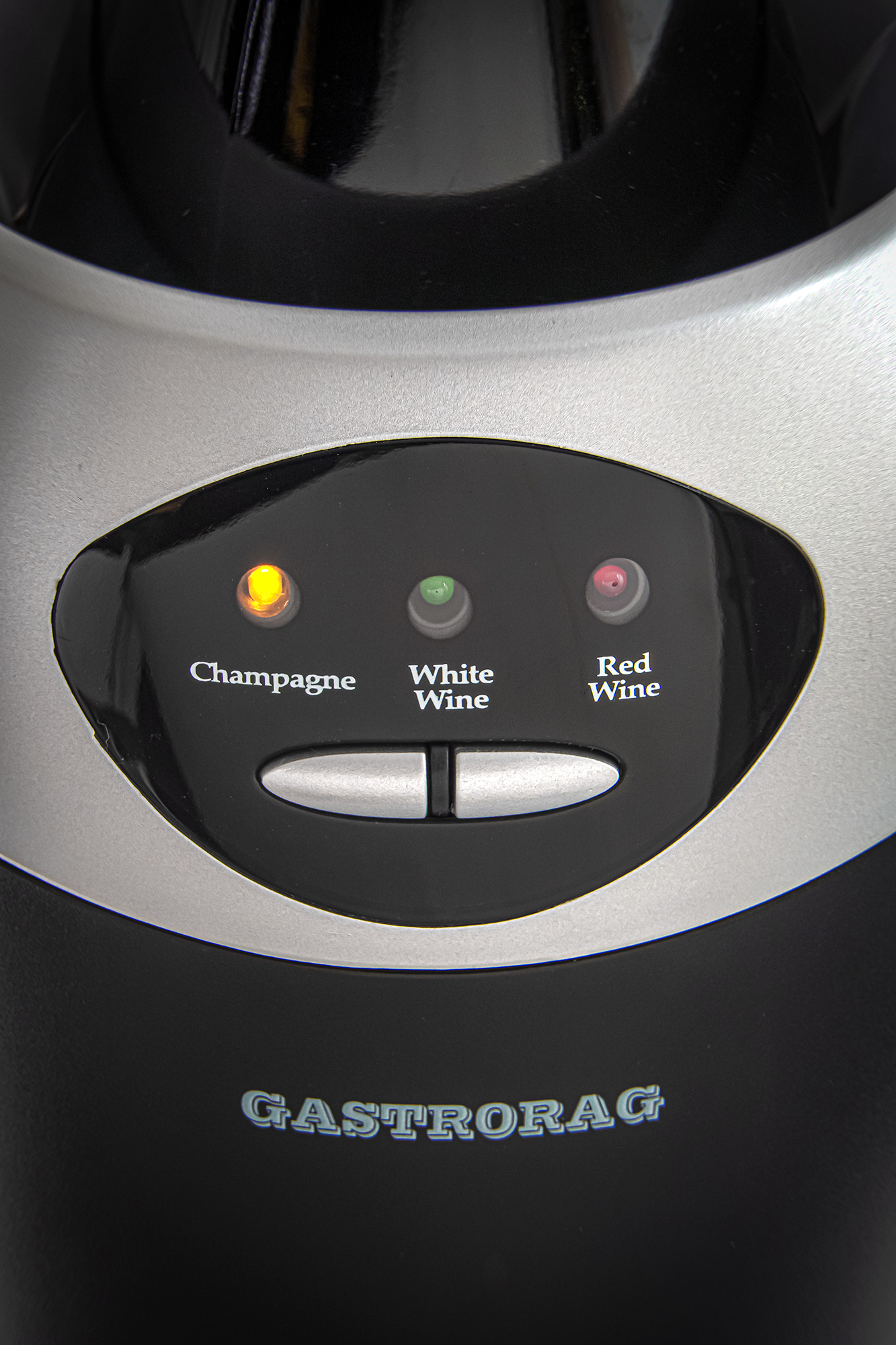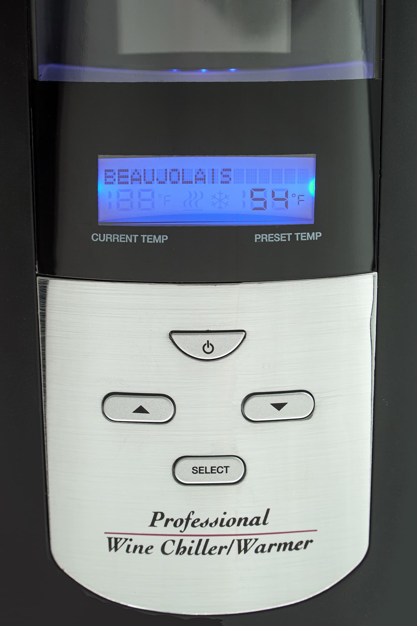 Под светодиодами располагаются две кнопки без надписей. Левая кнопка включает прибор, при помощи правой можно выбрать тип вина и, соответственно, желаемую температуру, до которой следует охладить бутылку.