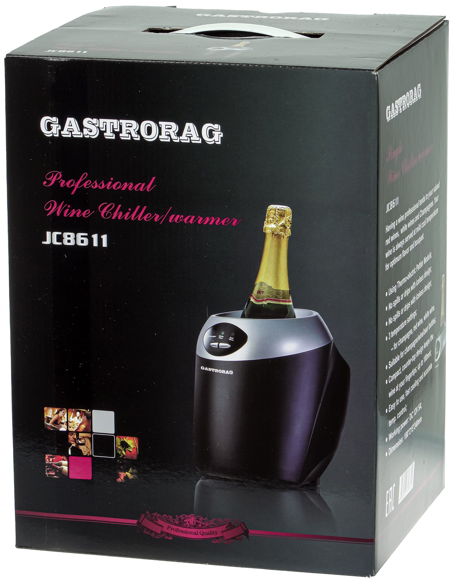 А вот на боковых сторонах коробки сведений значительно больше. Производитель обещает, что с охладителем Gastrorag JC8611 вина всегда будут поданы с нужной температурой, позволяющей наилучшим образом раскрыть букет. Мы узнаём, что благодаря термоэлектрическому элементу Пельтье охлаждение бутылок не сопровождается образованием льда или капель на поверхности сосуда, что устройство имеет три режима температуры — для красного, белого и шампанского, охлаждает быстро и точно, а размер охлаждаемой камеры позволяет использовать бутылки шампанского, винные и даже пивные.