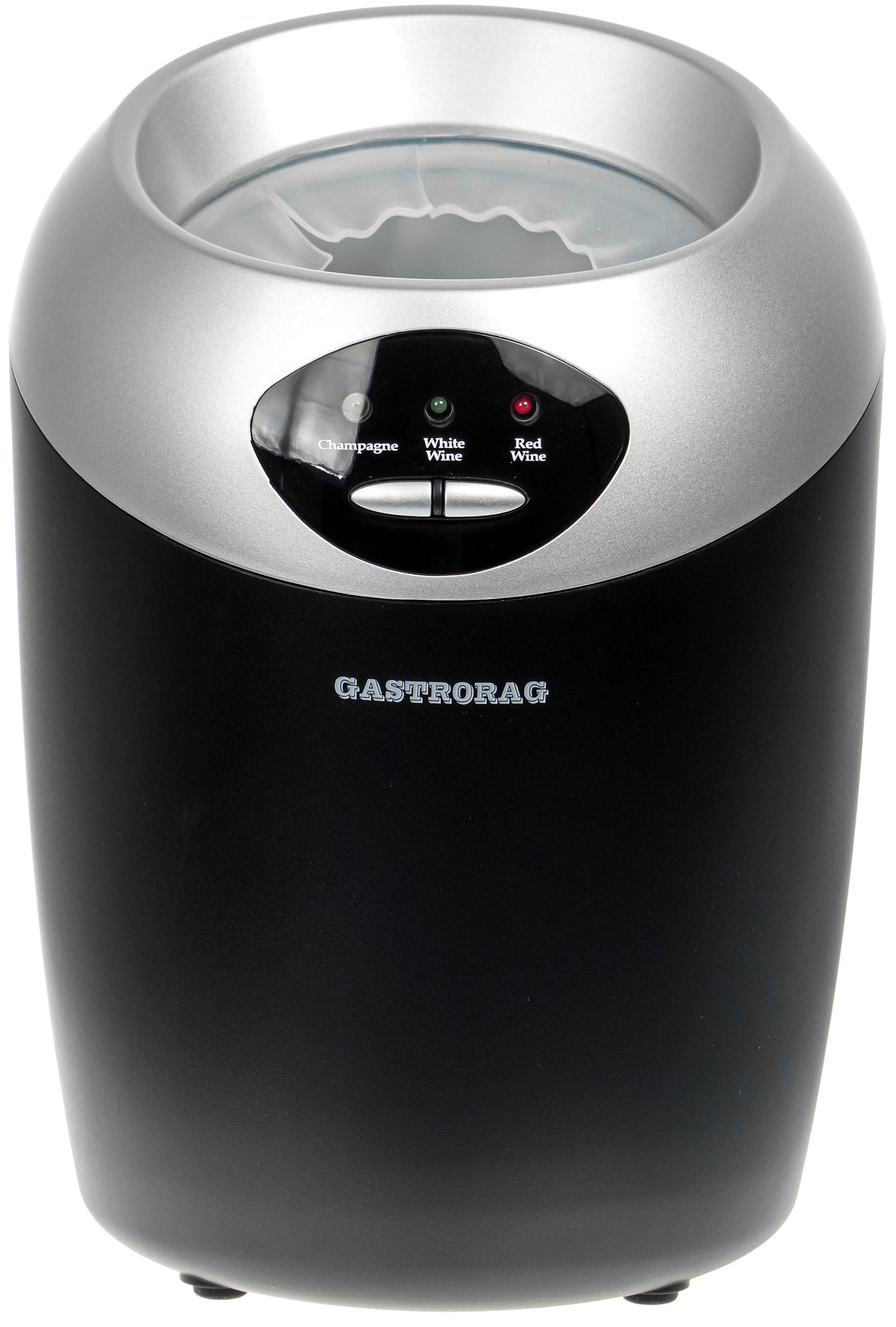 Выполненный из черно-серебристого пластика корпус прибора имеет округлые обводы. Конструкция рассчитана на охлаждение вертикально стоящей бутылки.