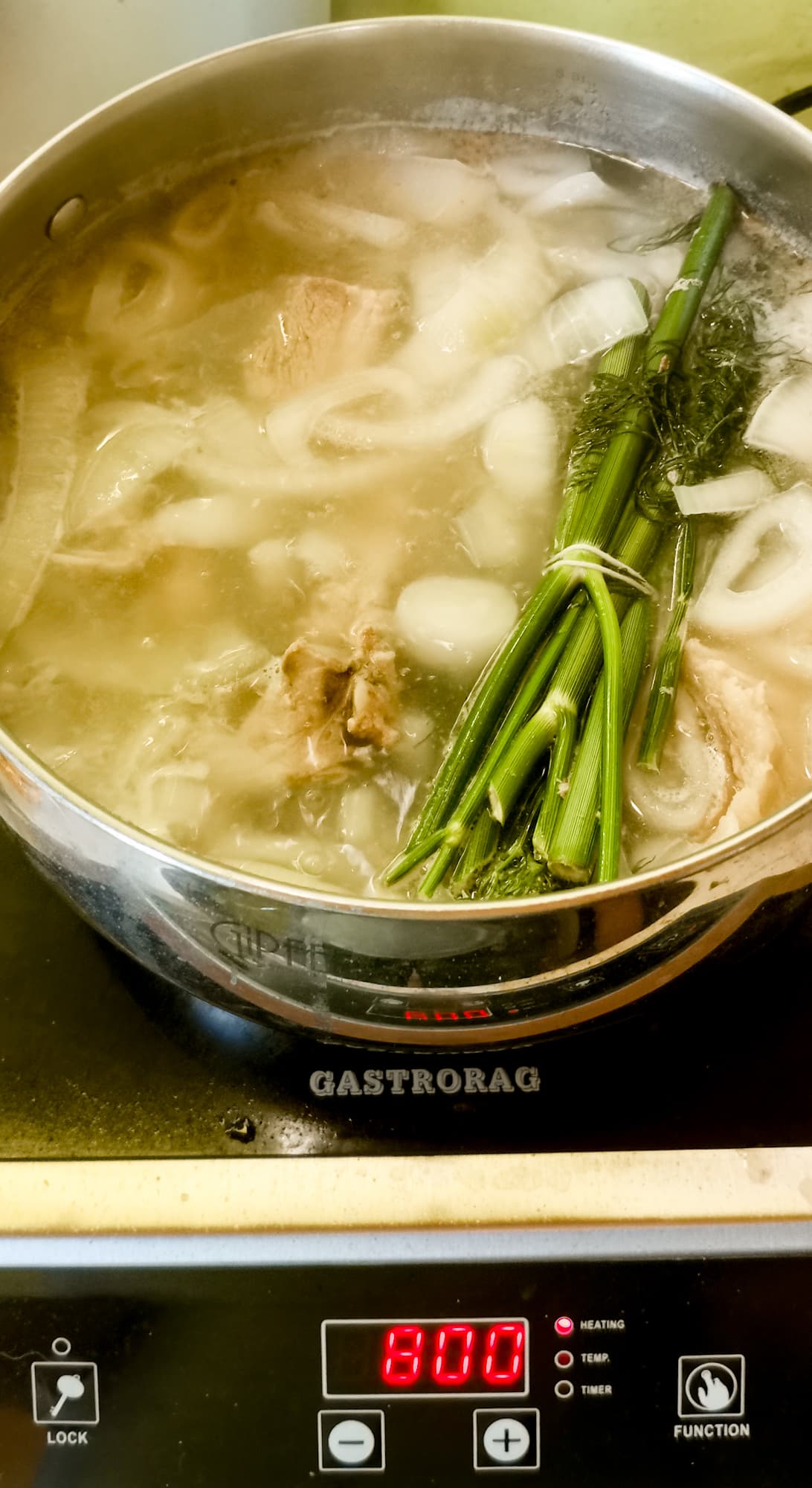 Для основы супа мы взяли бараньи ребра, лук и специи. Бульон делали на малой мощности, не давая ему активно кипеть в течение часа.