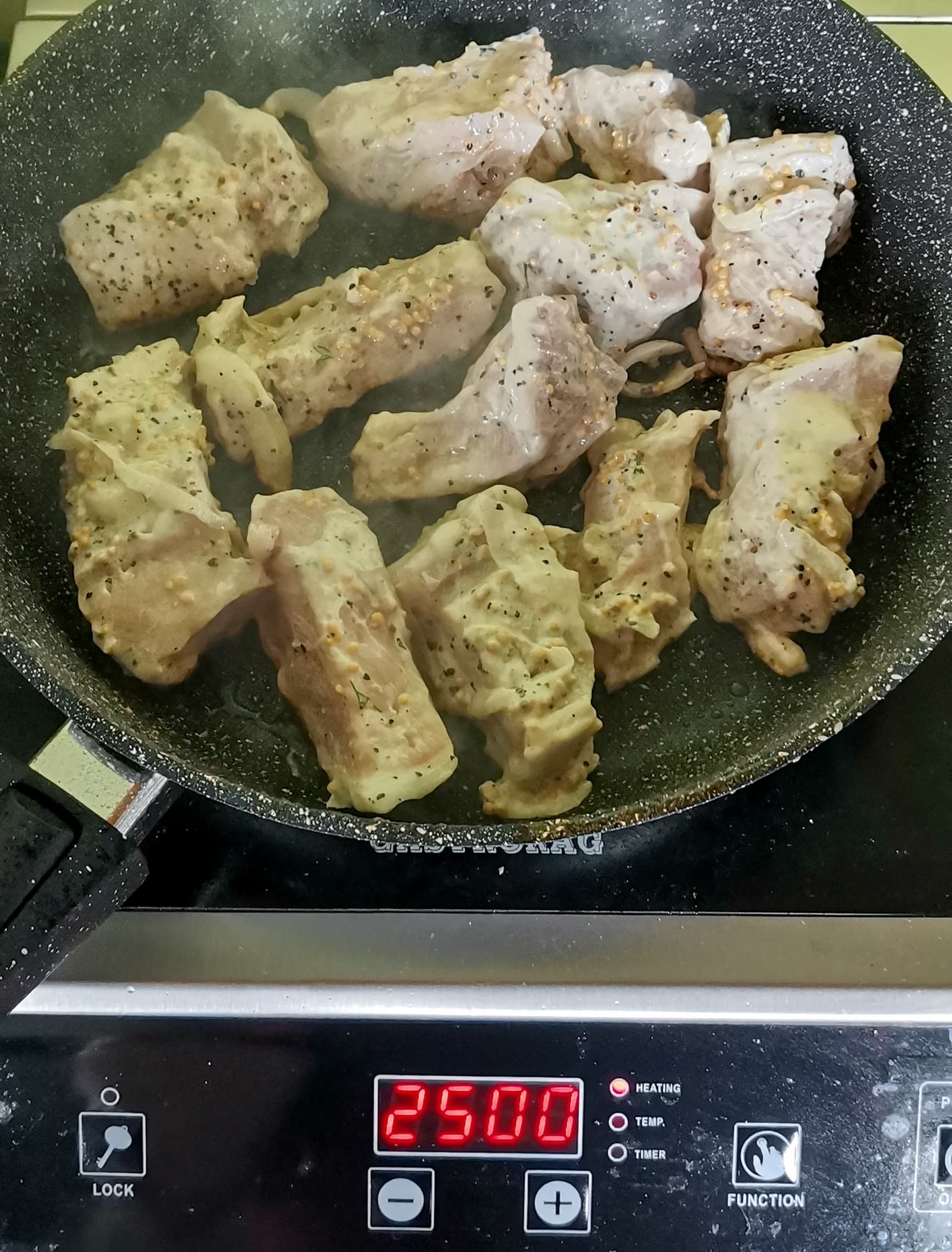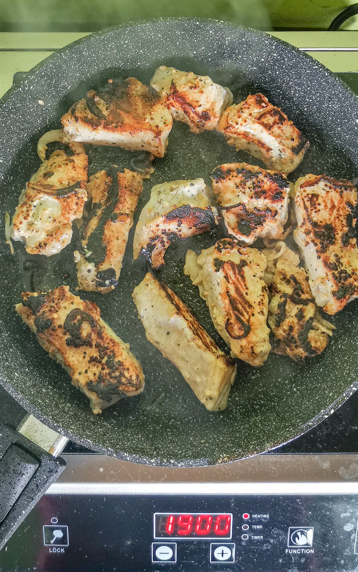 Мы решили проверить, сможем ли мы приготовить мясо, похожее на шашлык с использованием мощной плиты. Замариновали свинину в сливочном соусе с горчицей и луком. На сильно разогретую сковородку с небольшим количеством масла выложили мясо. Мощность 3000 Вт оказалась избыточна — мы обжаривали кусочки на 2500 Вт, специально дав им немного подгореть.