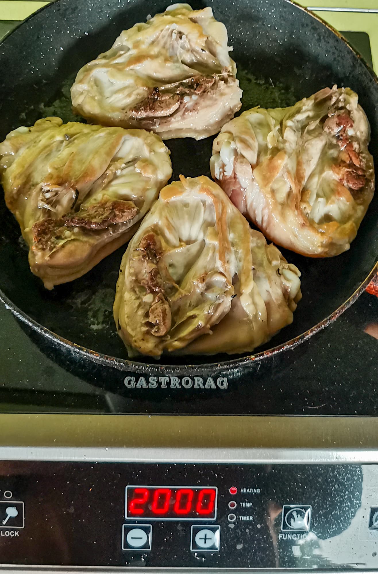 Пока он доходил до готовности, мы разделали курицу, бедра подготовили для жарки — натерли солью и специями. После того, как картофель сняли с плитки, слили воду и накрыли крышкой, на плитку поставили нагреваться сковородку большого диаметра, выставив мощность 2500 Вт. Буквально через минуту сковорода нагрелась, и мы выложили на нее куриные бедра. Для получения золотистой корочки потребовалось всего 2-3 минуты, после чего мы уменьшили мощность до 2000 Вт и доводили курицу до готовности, полив сметанным соусом и закрыв крышкой.