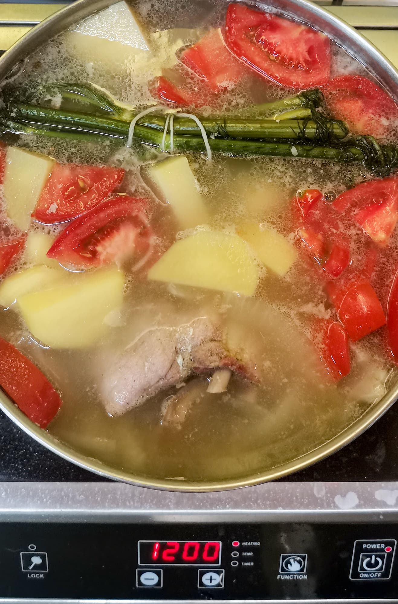 Затем покрошили в бульон картошку и помидоры, выставили мощность 1200 Вт.
