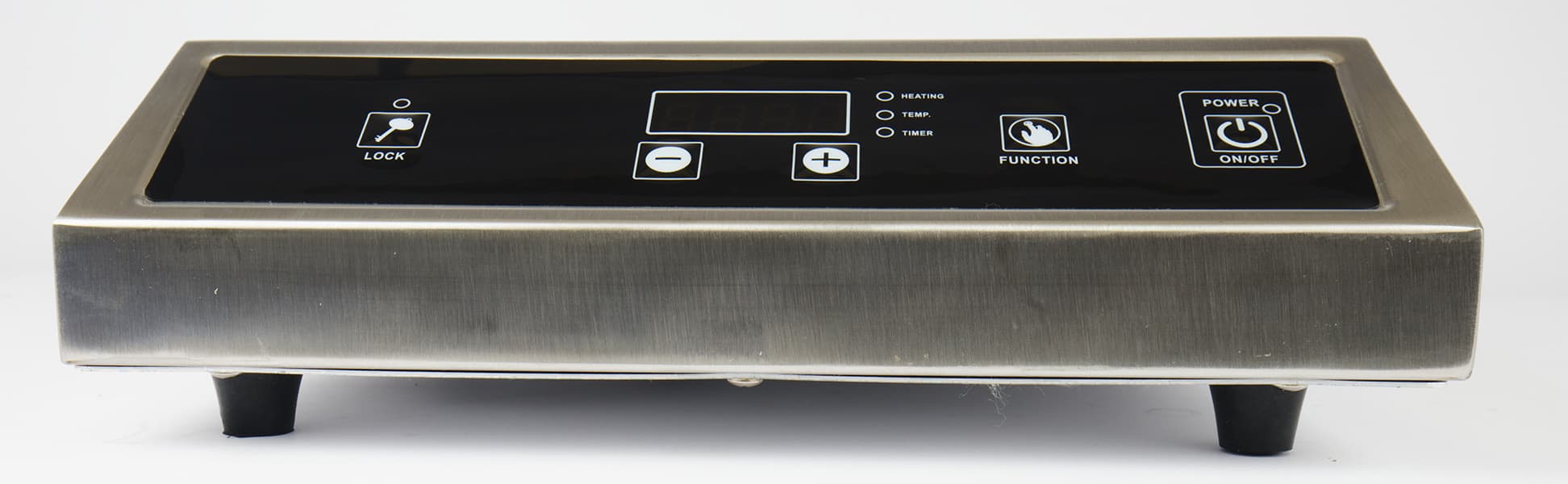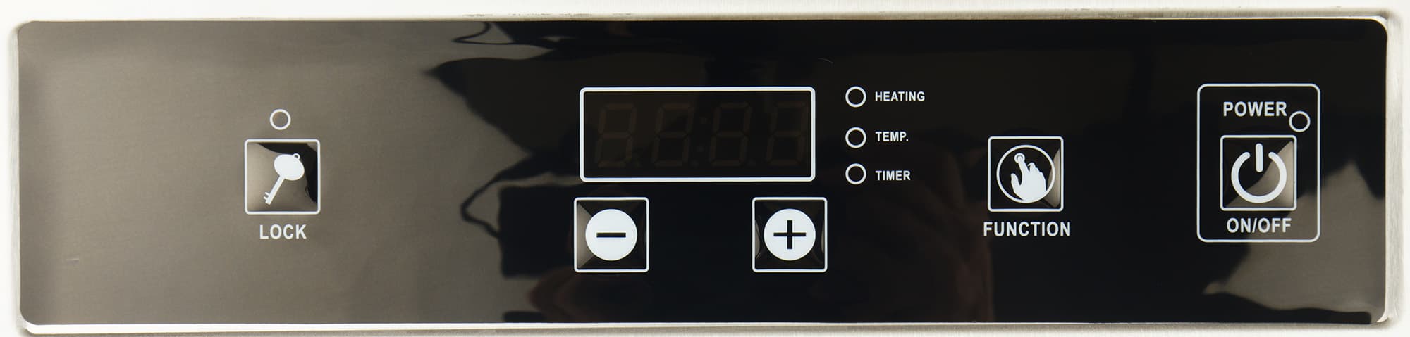 Кнопка включения/выключения — крайняя справа, кнопка блокировки панели от случайного нажатия — крайняя слева. Дисплей, отображающий текущую мощность или температуру (на выбор), находится по центру. Справа от него индикаторы мощности, температуры и таймера. Под дисплеем две кнопки управления «+» и «−», ими задаются значения мощности, температуры и таймера. Между индикаторами и кнопкой включения располагается кнопка выбора установок — мощности, температуры или таймера. После включения и нажатия на кнопку выбора прибор начинает работать по умолчанию на мощности 2600 Вт (температуре 180 °C) до дальнейшего введения других значений.