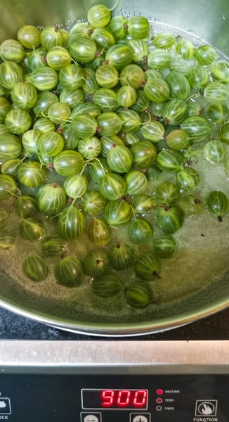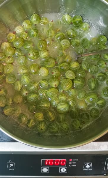 Крыжовник сначала плавно нагревали, высыпав в сироп, затем резко подняли мощность, довели до первых пузырьков и разлили по банкам.