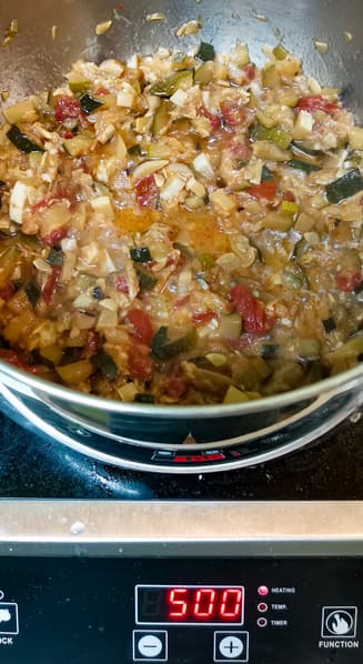 Рагу мы готовили из кабачков, помидоров, лука и болгарского перца. В кастрюлю с добавлением масла мы сложили все овощи слоями, тушили на небольшой мощности под крышкой. Затем перемешали, выровняли по соли и специям, довели до полной готовности.