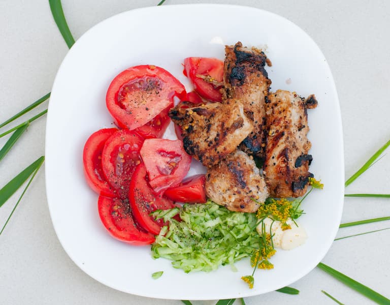 Подали со свежими овощами. Свинина получилась хорошо, действительно похожа по текстуре на шашлык, разве что без запаха дыма.