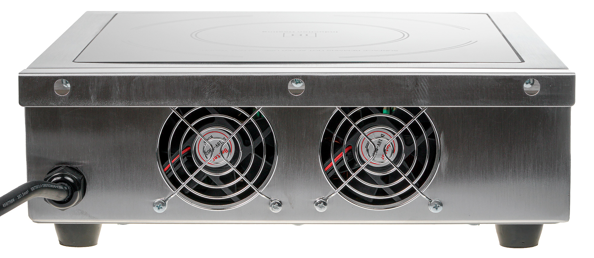 С тыльной стороны находятся два вентилятора охлаждения, закрытые металлической сеткой. Тут же крепится довольно толстый шнур питания. Задняя планка служит ограничителем, не позволяющим пододвинуть плитку вплотную к стене. Она же может быть использована для крепления плитки к стене.