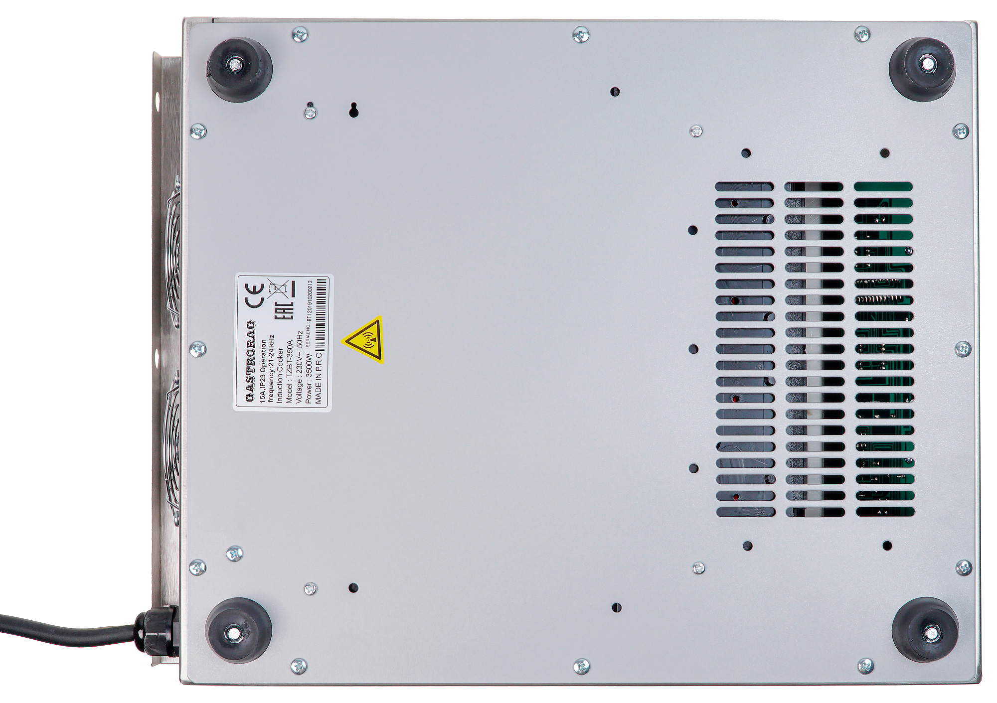 На дне можно увидеть информационную наклейку, вентиляционные отверстия и массивные резиновые ножки.