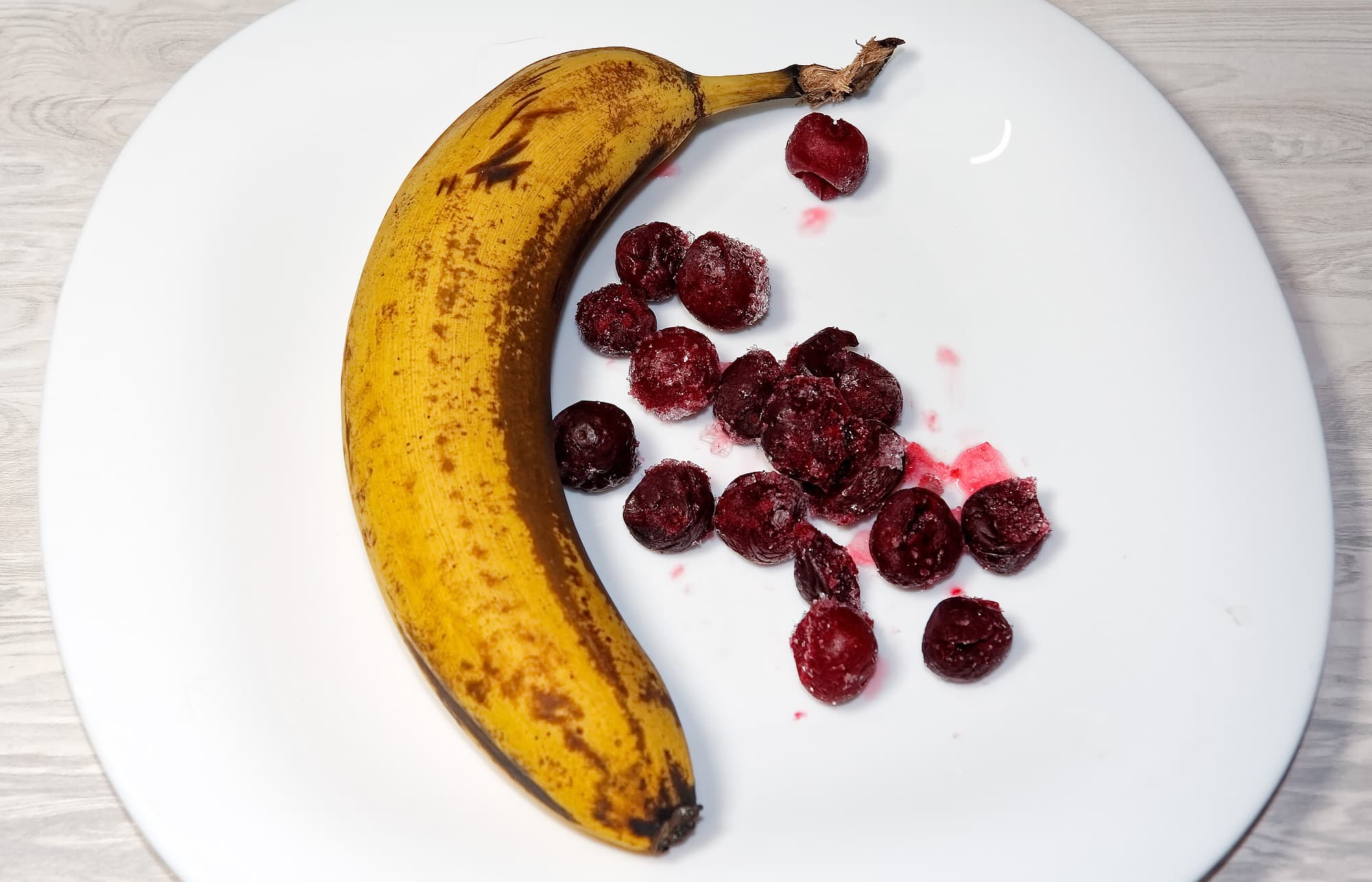 Для смузи мы взяли очищенный банан, пригоршню замороженных ягод вишни и молоко. Поместили все в чашу блендера, измельчали в режиме «смузи».