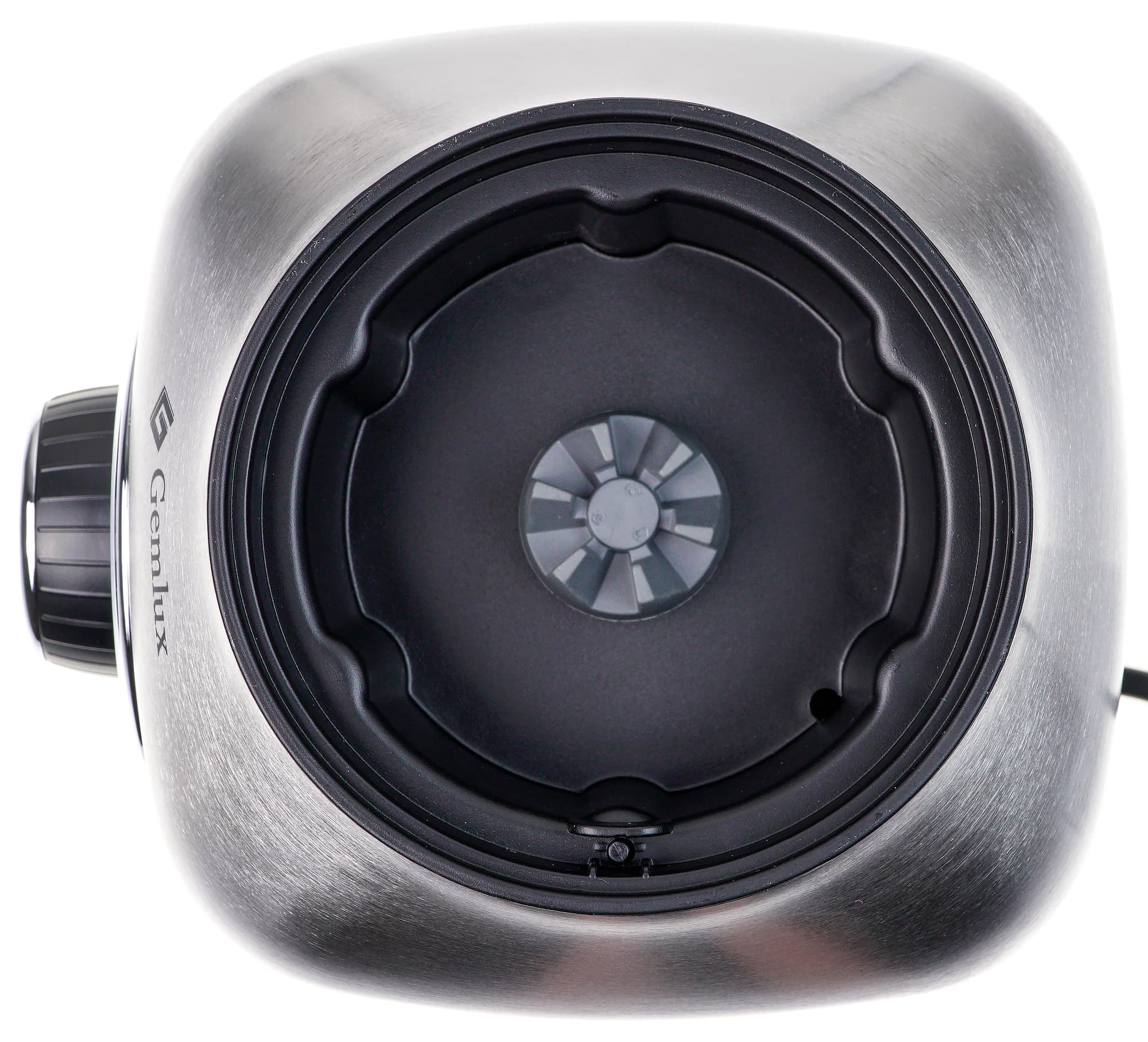 Сверху расположен пластиковый разъем для установки кувшина. Место стыковки кувшина с моторным блоком сделано из плотной резины, которая обеспечивает хорошее сцепление и гасит лишние вибрации. Кувшин устанавливается строго вертикально, в любом из шести предусмотренных положений. Поворачивать его для фиксации не нужно. У блендера предусмотрена защита от включения при неправильной сборке (снизу на фото можно увидеть скрытую кнопку, которая нажимается лишь при установленном кувшине).