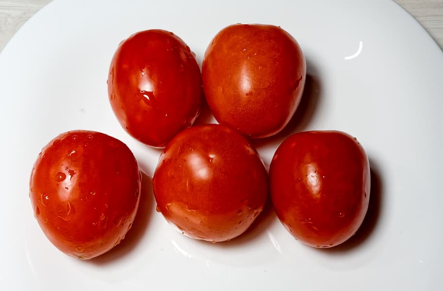Для теста мы взяли около килограмма помидоров с достаточно жесткой и толстой шкуркой. Помидоры были разрезаны на 2-4 части, плодоножка удалена.