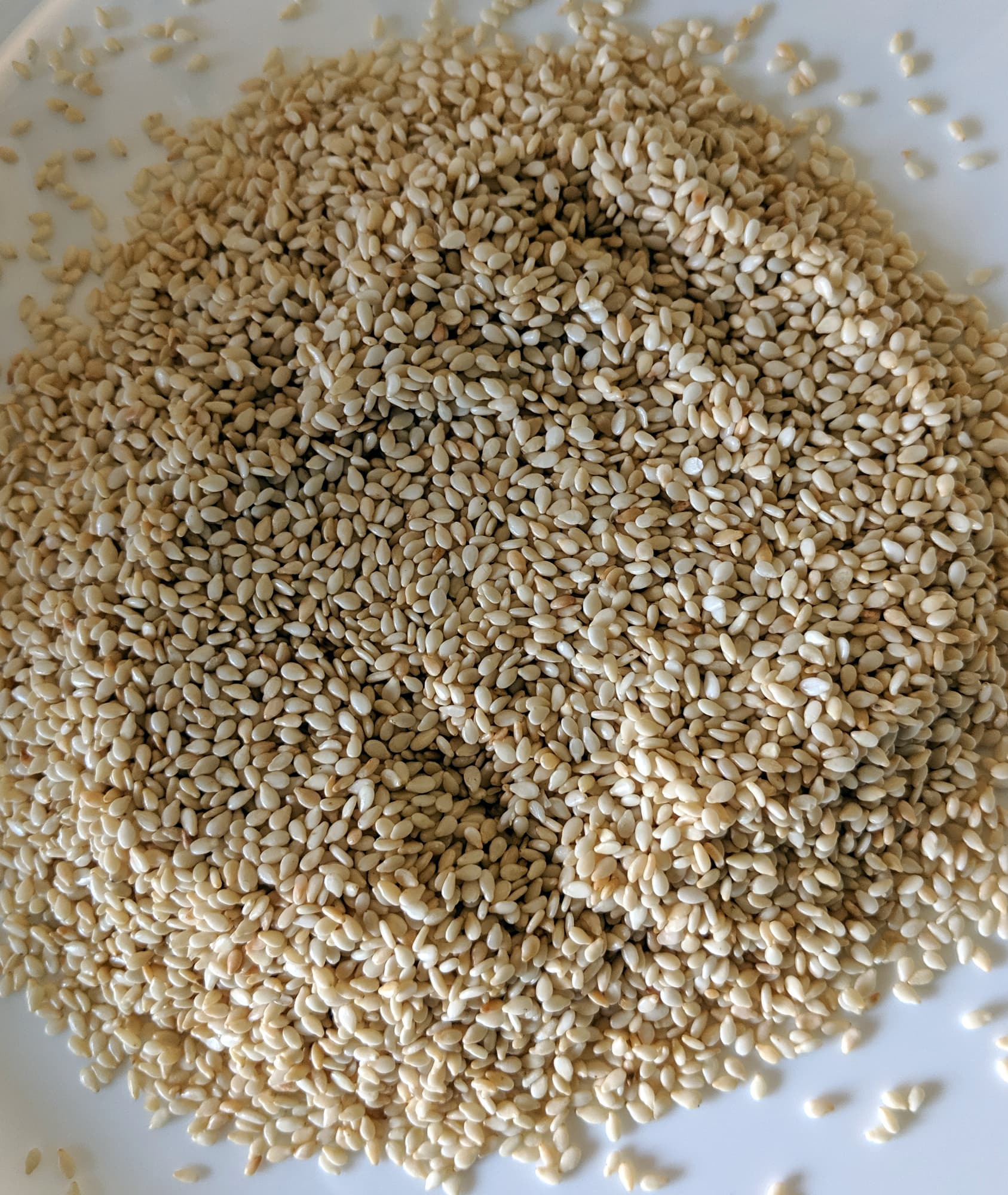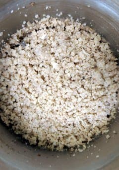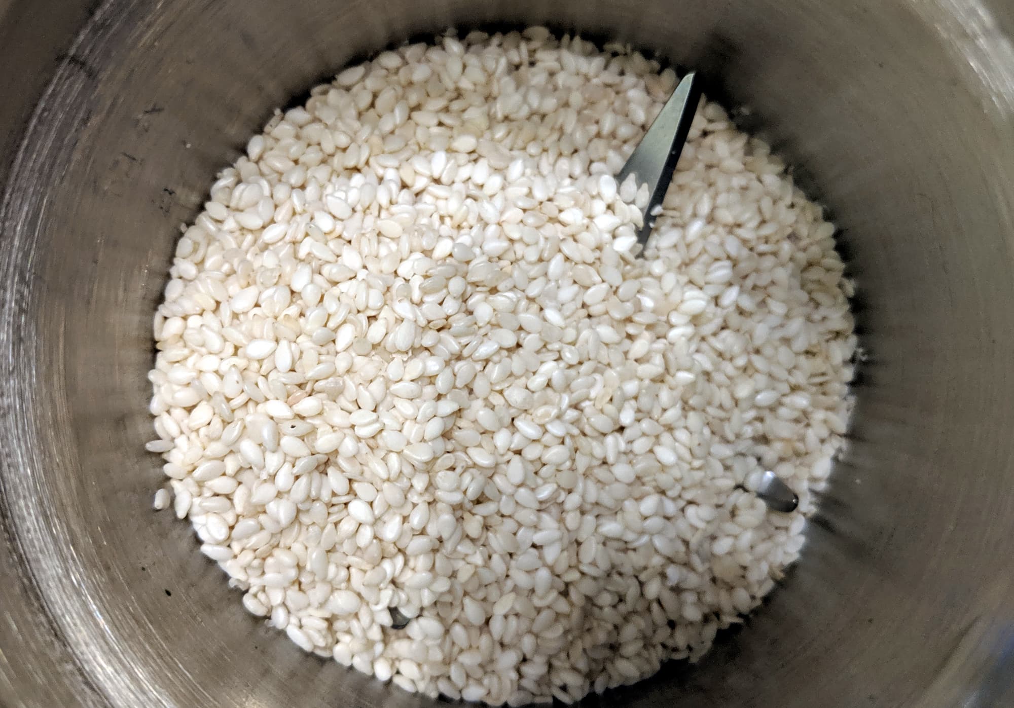 Мы высыпали в чашу с крестообразным ножом 40 граммов (1 пачку) кунжута. За 12 секунд все зернышки, кроме двух-трех, прилипших к крышке, превратились в жирноватую муку.