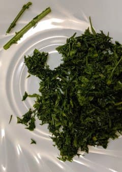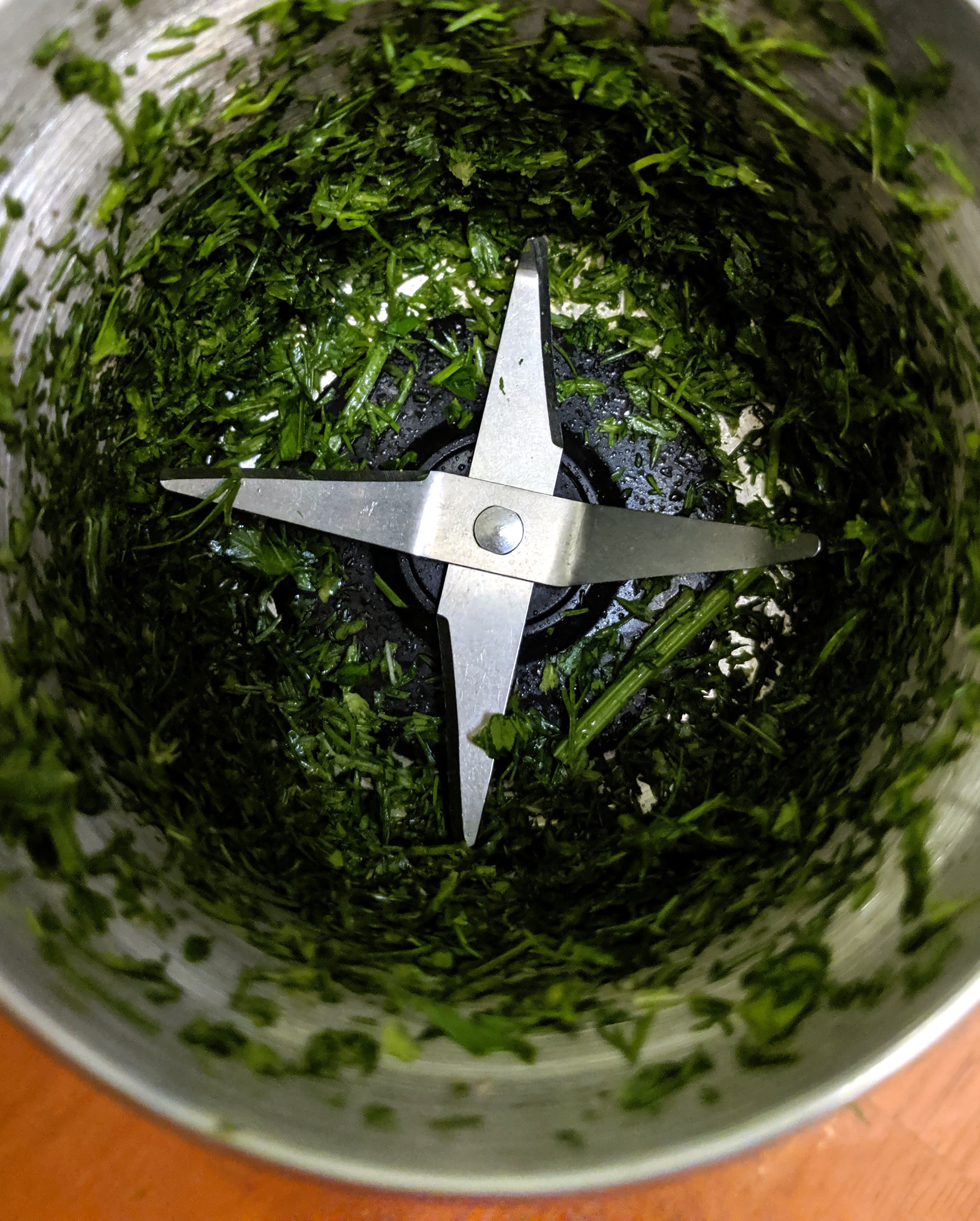 Мы взяли пучок зелени, нарезали его крупно и положили в чашу с крестообразным ножом. За пять секунд зелень была вполне качественно измельчена, осталось только несколько пеньков от наиболее толстых стеблей. Молоть дальше было бессмысленно, так как нежные листья превратились бы в труху. Поэтому делаем вывод: отделяем листья от стеблей и мелем по отдельности.