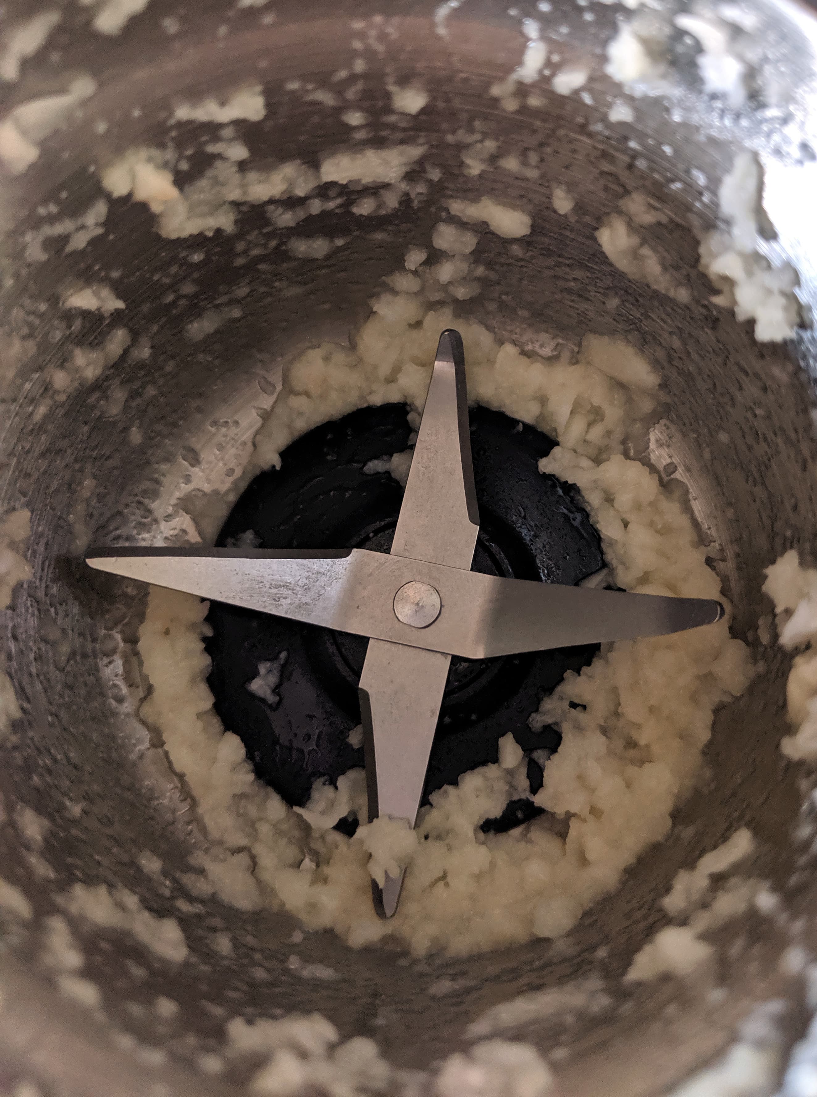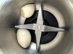 Два зубчика чеснока за пять секунд стали чесночной крошкой, ровным слоем распределенной по всей чаше. С помощью чайной ложки мы вынули измельченный чеснок оттуда практически полностью, но для более быстрого результата, конечно, надо молоть чеснока побольше.